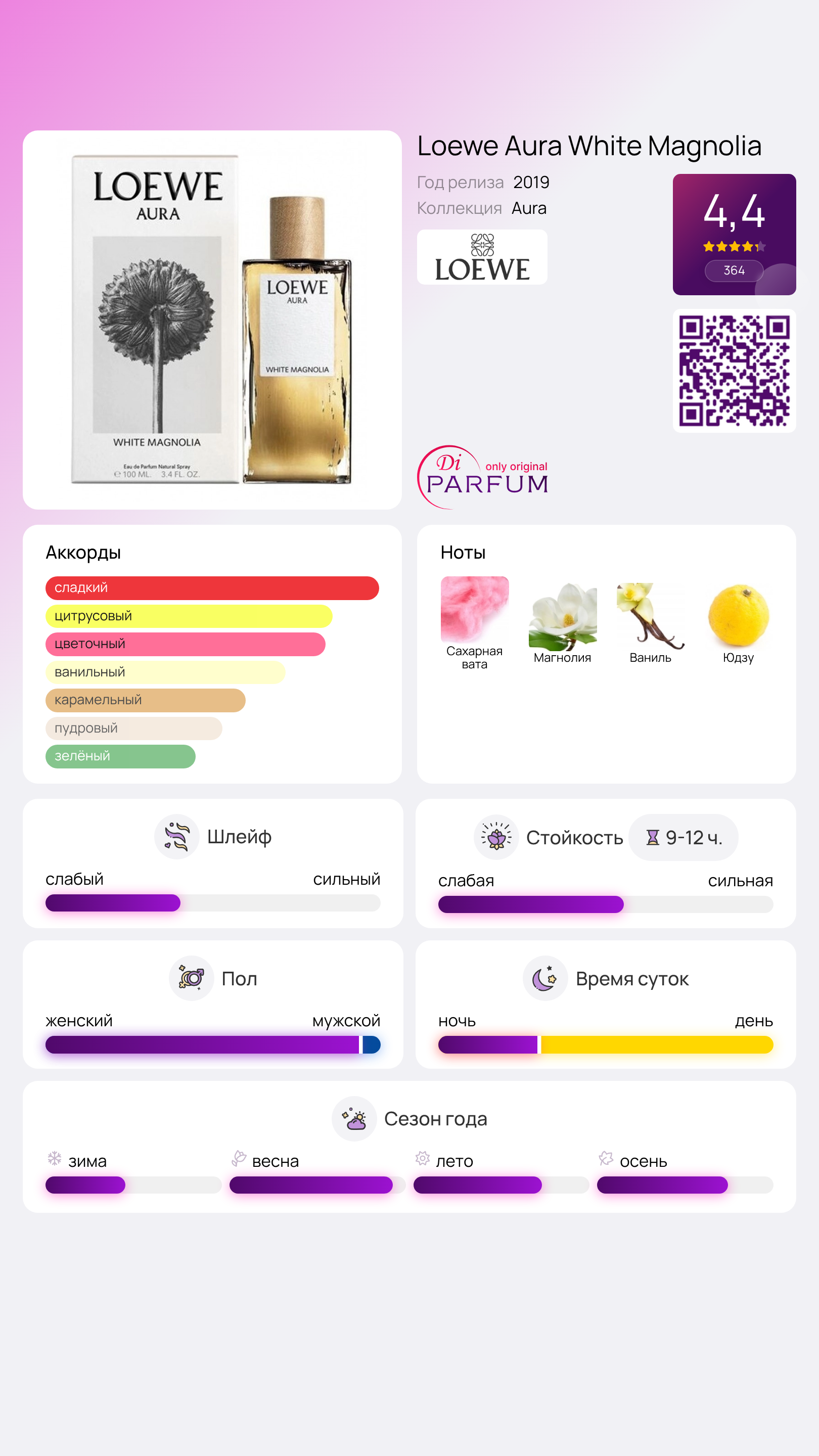 Содержание натуральных эфирных масел в составе достигает 20%, а инновационная структура аромата формируется вокруг центральной ноты – Белой Магнолии, которая излучает мягкость и грацию, подчеркиваемую желтым пыльцевым акцентом. В его сердце также присутствует заметный оттенок экстракта ванили, в то время как освежающий юзу, посыпанный сахарной ватой, добавляет приятное цитрусовое звучание.