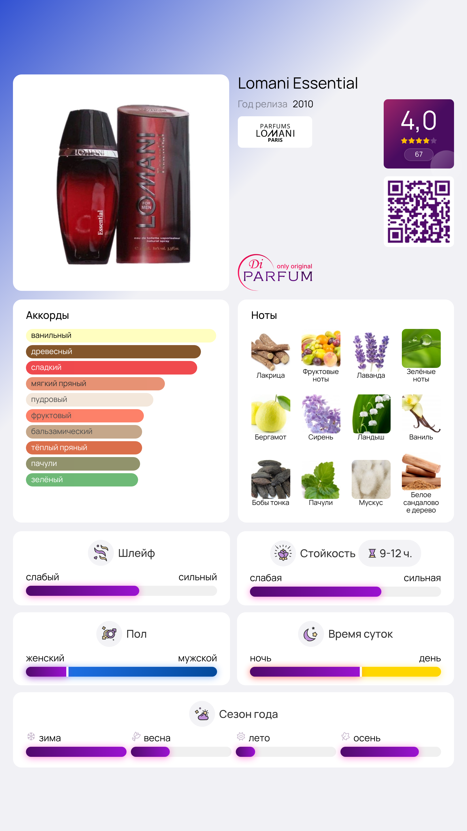 Lomani Essential представляет собой уникальный аромат-энергетик от французского бренда Lomani. Его композиция наполнена энергией бергамота, фруктовыми нотами, свежестью зелени и лакричника, которые гармонично сочетаются с цветами лаванды.