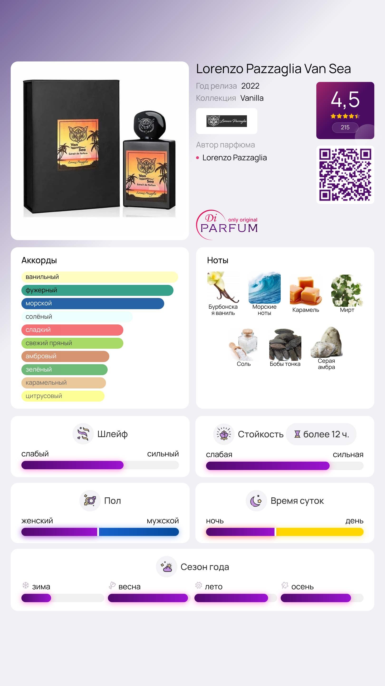 Этот увлекательный аромат представляет собой удивительное сочетание гурманских и морских нот, которые создают уникальную атмосферу свежести и сладости. В его составе можно отметить богатство натуральных ингредиентов, таких как ваниль — как бурбонская, так и мадагаскарская, придающие аромату интимную теплоту и окутывающую сладость.