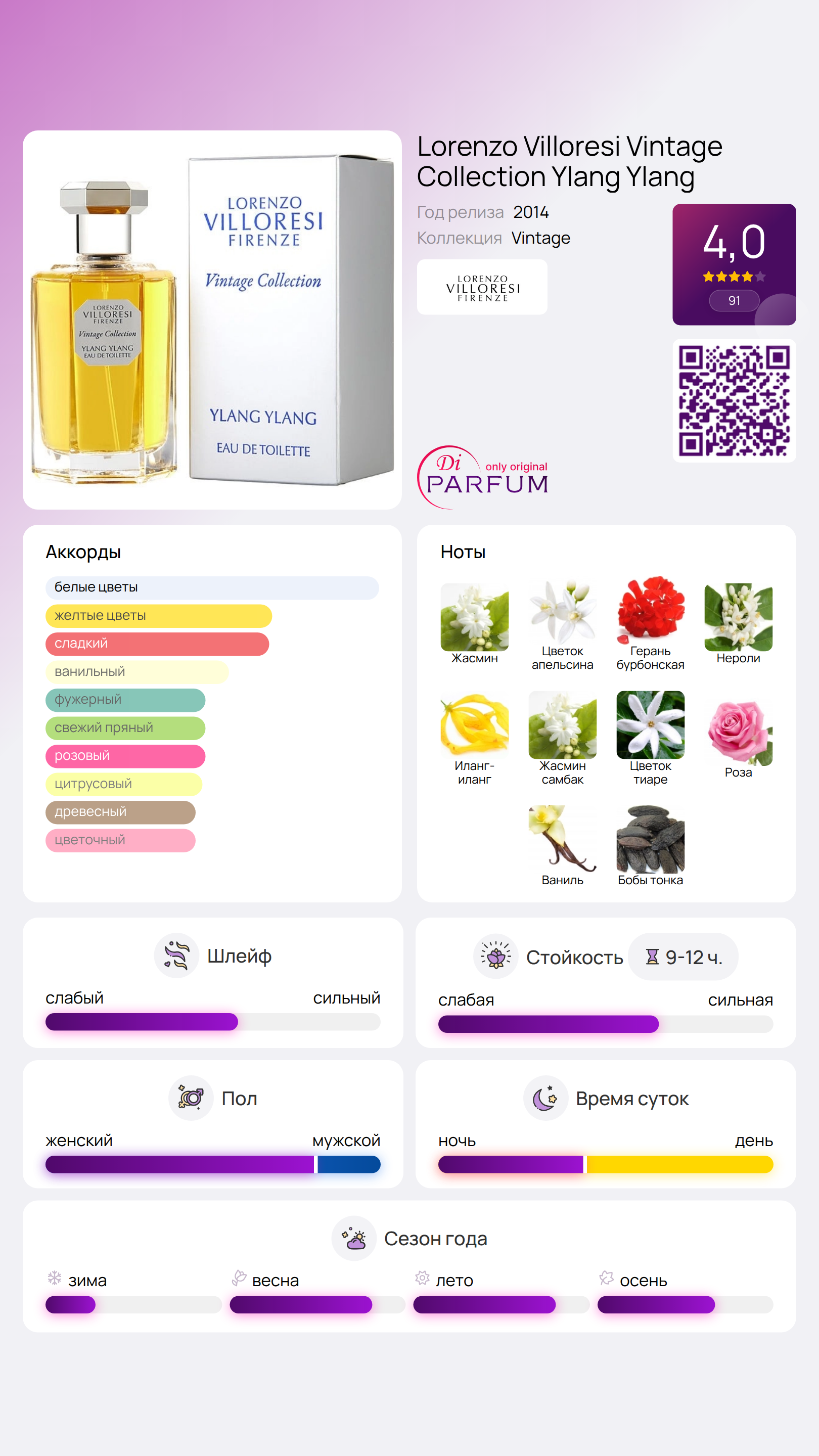 Интенсивный аромат тиаре (таитянской гардении) вызывает воспоминания о волшебных ночах ее цветения, а рядом с ней величественно располагается аристократическая роза. Аромат Vintage Collection Ylang Ylang от Lorenzo Villoresi можно сравнить с весенне-летним букетом, оформленным в современном стиле. Этот флакон туалетной воды был выпущен известным итальянским брендом в 2024 году, а его воздушный дизайн подчеркивает естественную гармонию ароматического эликсира.