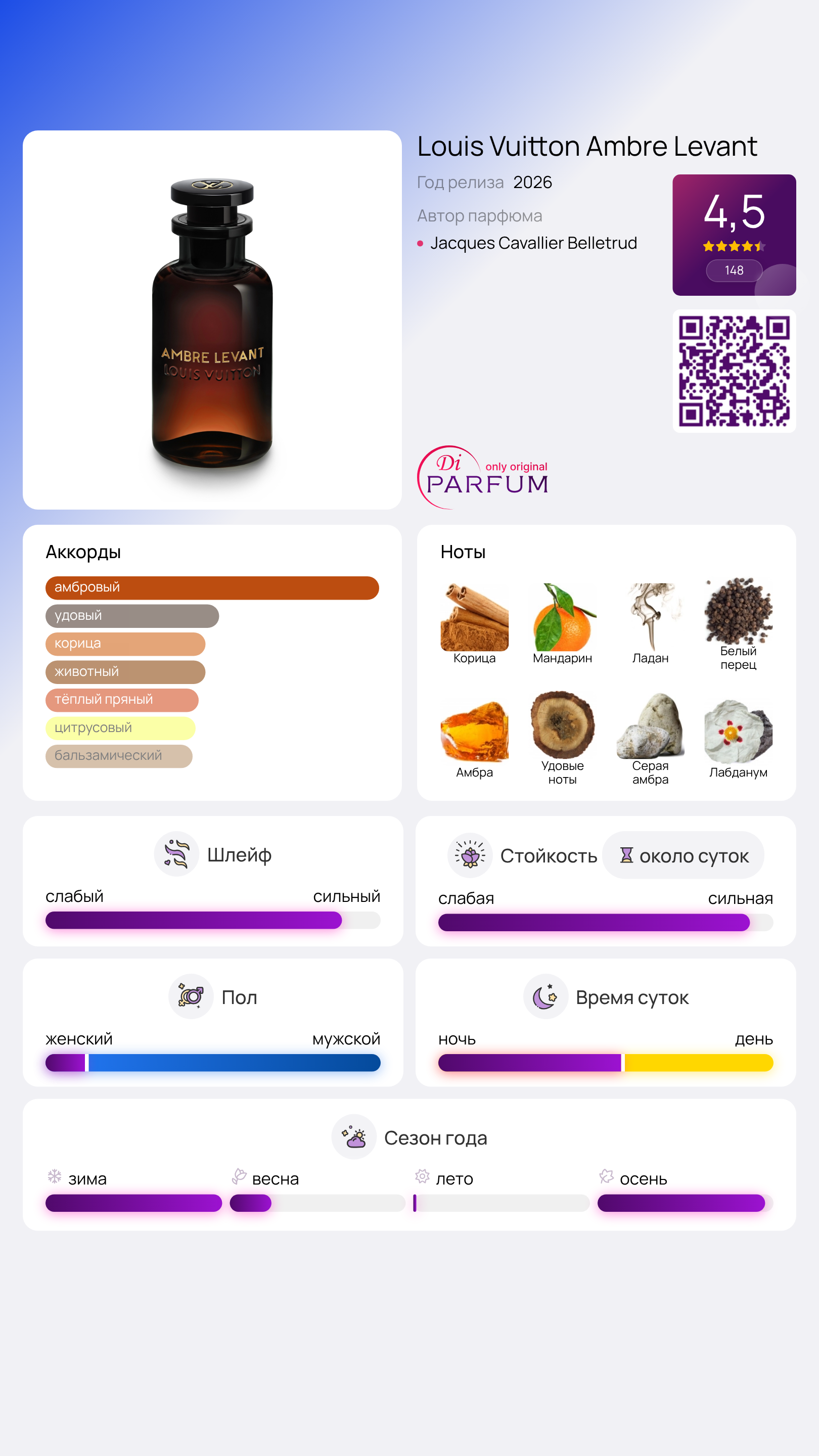 Композиция Ambre Levant открывается сочным мандарином, который уступает место пряной корице и белому перцу, создавая ощущение щедрости восточных угощений. В сердце расцветает благородный ладан, а база раскрывается глубоким союзом амбры, лабданума и редкого уда от эксклюзивного поставщика Louis Vuitton, придающего аромату изысканную древесную глубину.