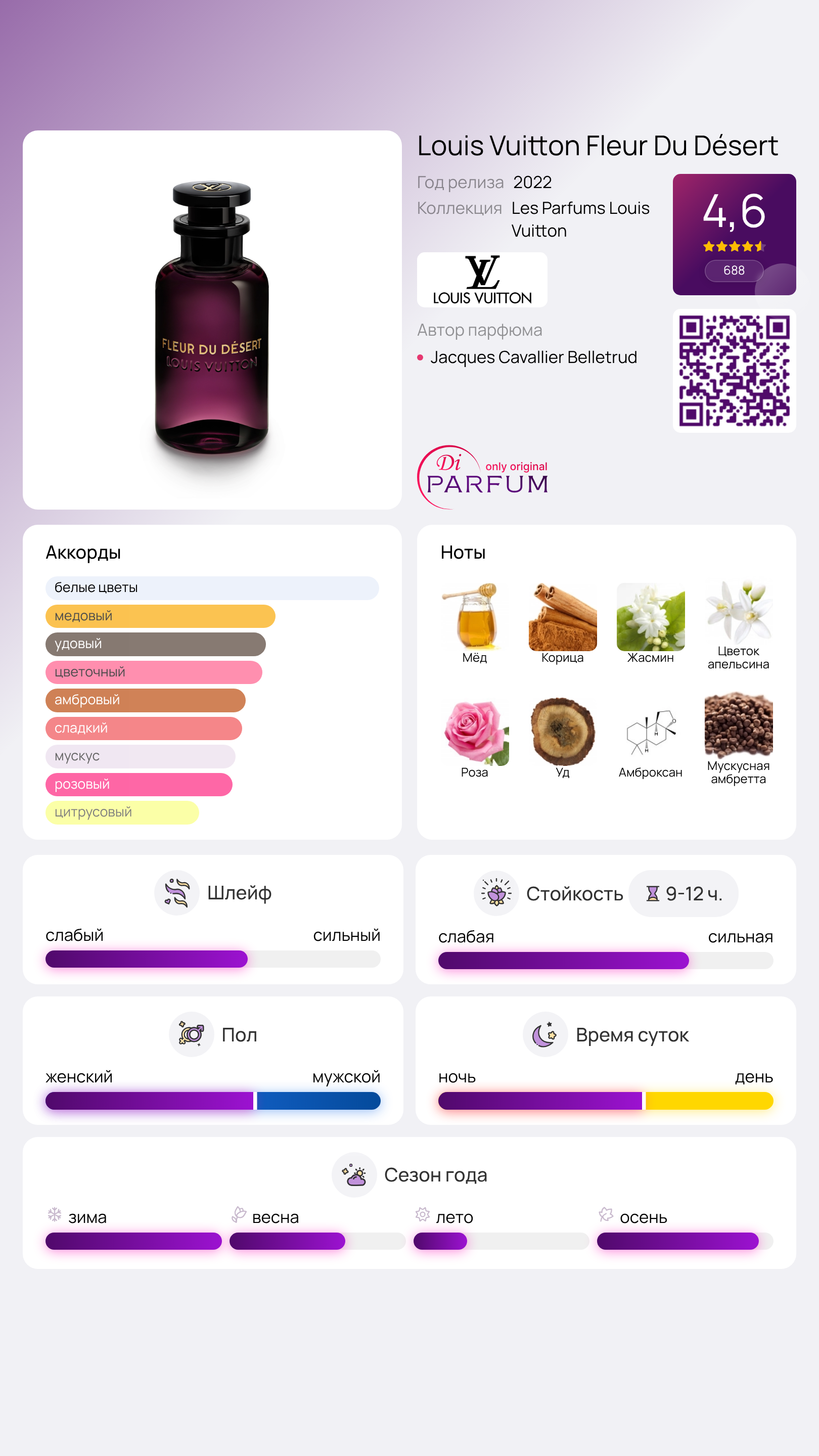 Базовые ноты агарового дерева, амброксана и амбретты дарят аромату стойкость и глубину, оставляя за собой шлейф, который невозможно забыть. Louis Vuitton Fleur du Désert — это не просто парфюм, это история, которую вы будете носить с собой, создавая свой уникальный стиль и атмосферу.