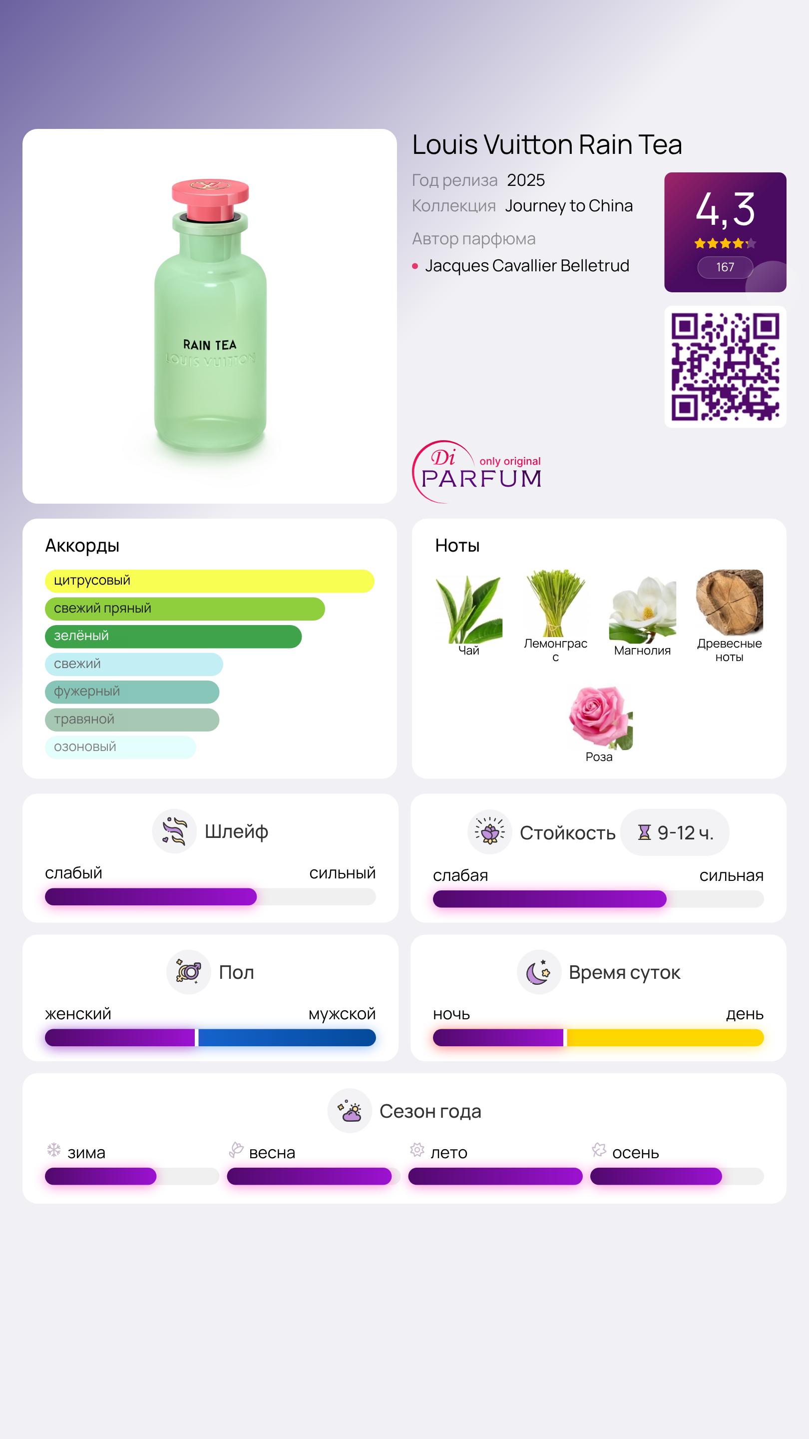 Louis Vuitton Rain Tea — это цветочно-древесный аромат из коллекции Journey to China, созданный Жаком Кавалье Бельтрудом в 2025 году. Вдохновлённый традиционной чайной церемонией и шёпотом природных стихий, этот парфюм переносит в атмосферу умиротворения, где каждый глоток чая раскрывает гармонию с окружающим миром.