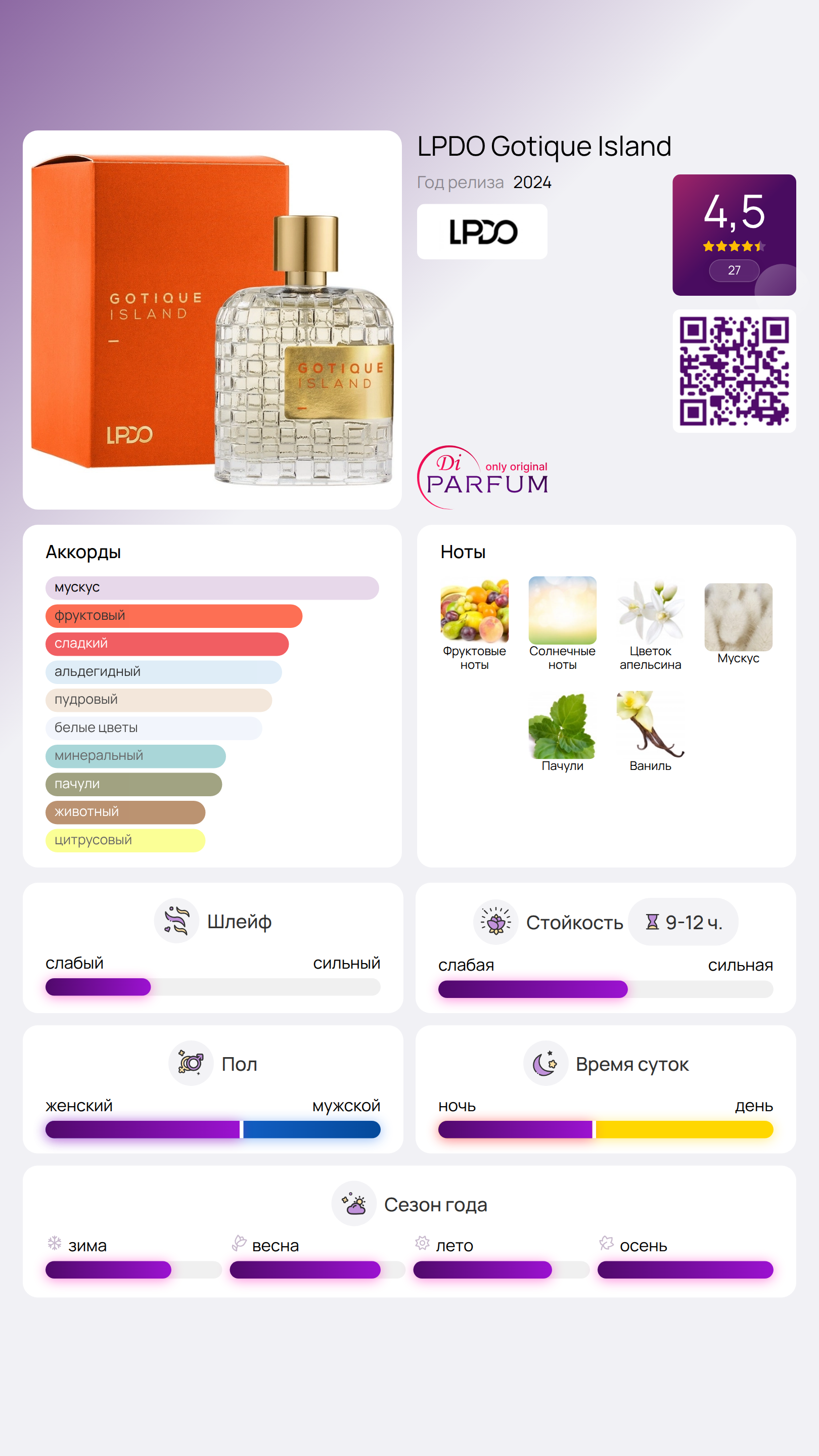 Gotique Island от LPDO поражает своим сладким и завораживающим звучанием, выделяясь из общей массы. Этот парфюм был создан итальянским брендом в 2022 году и отличается от других своим непринужденным стилем, который заставляет почу