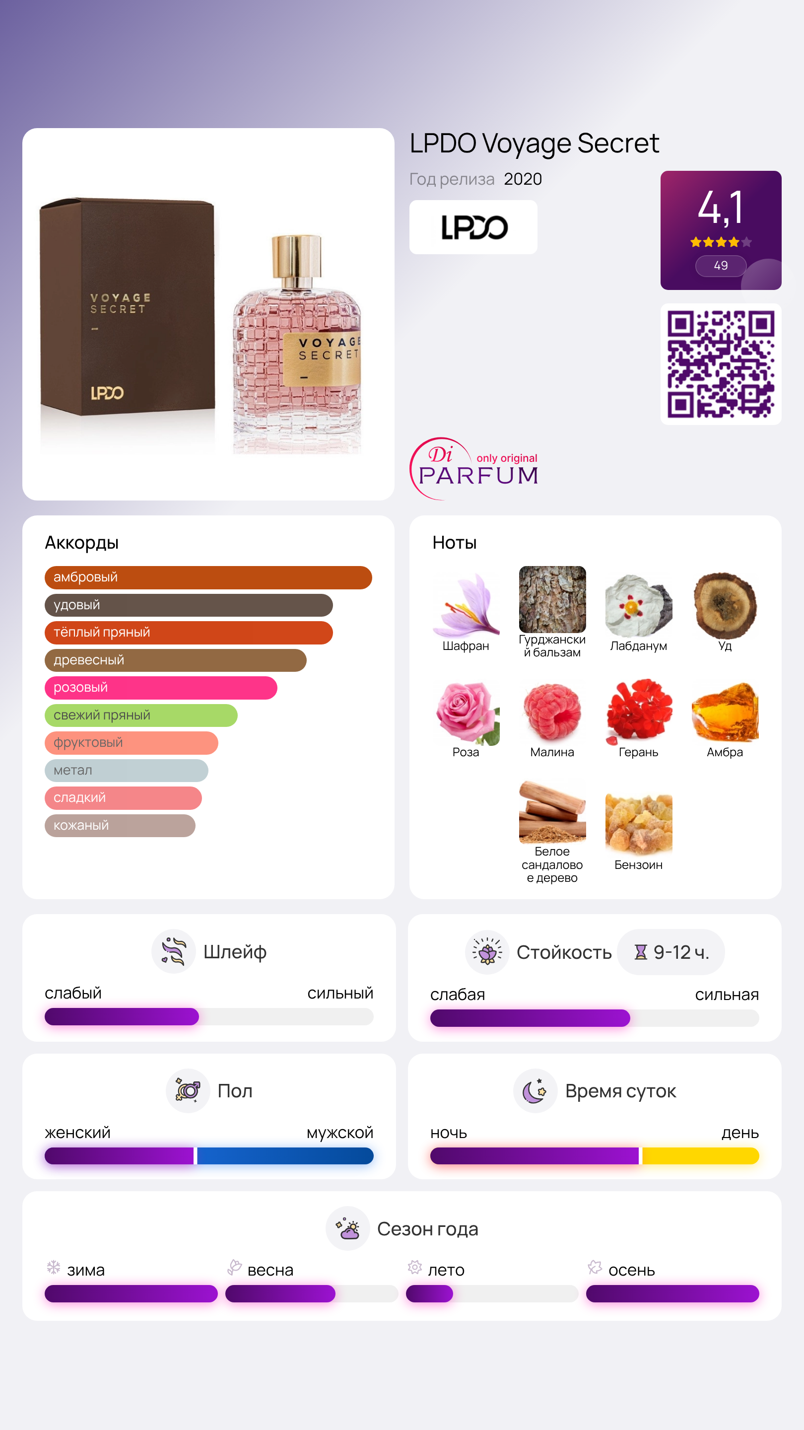 Легкая композиция Voyage Secret от LPDO забавна и дерзка, но при этом деликатна. Подходит как мужчинам, так и женщинам, предпочитающим уникальные ароматы. Способна радовать весь день. Парфюмерная вода была представлена итальянским брендом в 2020 году. Флакон придает шарм вашему интерьеру