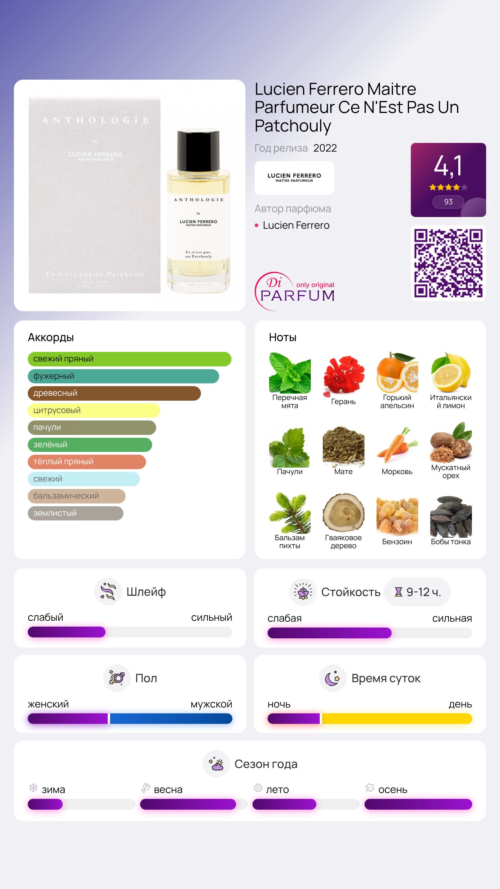 Солнечные цитрусы, включая терпкий лимон, яркий мандарин и сочные апельсины, наполняют композицию средиземноморской свежестью. Пряная розовая герань перекликается с мятой и терпкими семенами моркови, в то время как яркая зелень обретает новые оттенки благодаря бальзамическому мускатному ореху. Все это создает насыщенный и уютный аромат Ce N'Est Pas Un Patchouly, словно ольфакторные объятия, полные радушия. Интересно, что название эликсира вдохновлено работой Магритта «Вероломство образов», где под надписью «это не трубка» изображен именно этот образ.