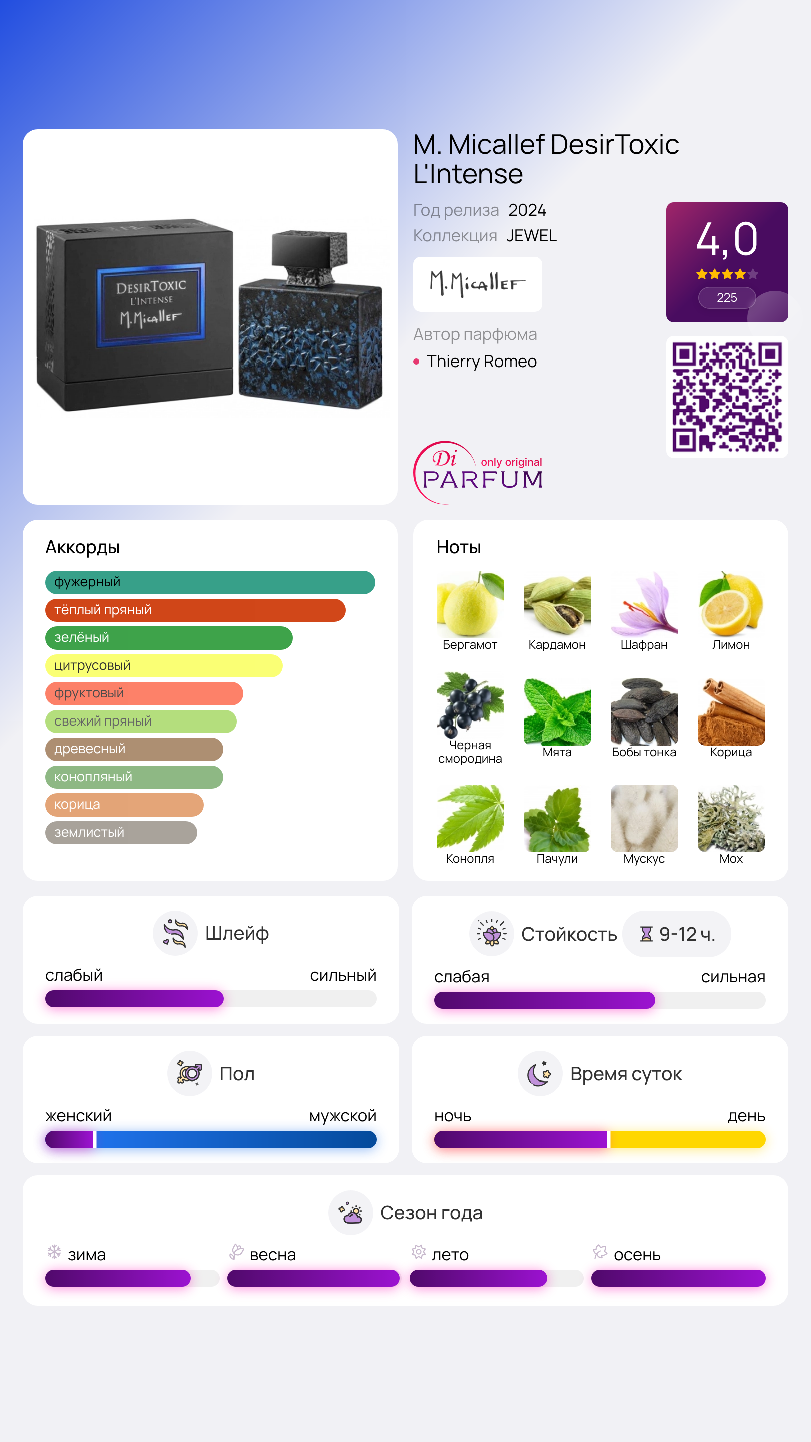 DesirToxic L'Intense от M. Micallef – это ароматический пряный парфюм для женщин и мужчин, который был представлен в 2024 году. Создателем этого удивительного аромата является талантливый парфюмер Thierry Romeo. В его композиции гармонично сочетаются яркие верхние ноты шафрана, бергамота, кардамона и лимона, которые вызывают чувство свежести и утонченности.