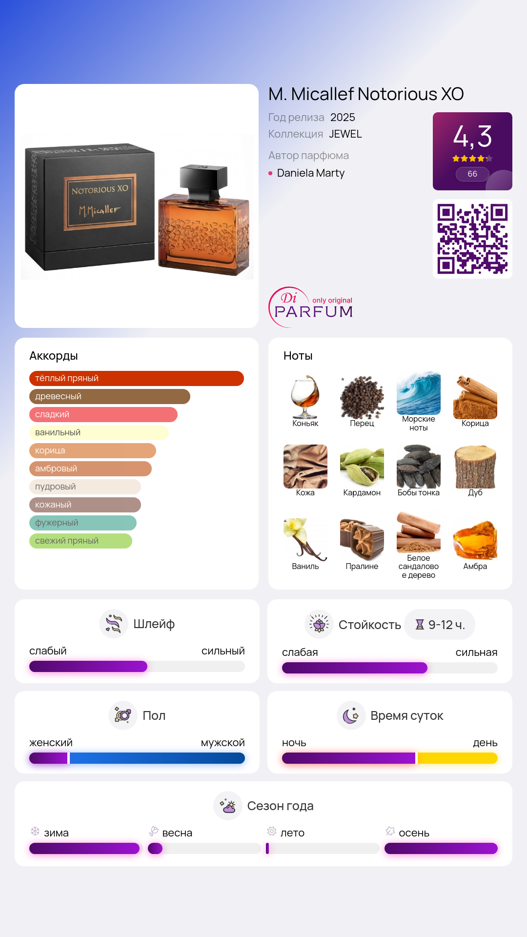Notorious XO от M. Micallef — это древесно-пряный аромат для мужчин, который был представлен в 2025 году. За его создание отвечает парфюмер Даниэла Марти. Этот необычный аромат открывается свежими нотами коньяка, перца и морских аккордов, создавая завораживающее первое впечатление. В сердце композиции звучат пряные ноты корицы, кожаные акценты, кардамон и сладость бобов тонка, что придаёт аромату уникальное обаяние. Завершают его богатые и тёплые базовые ноты ванили, пралине, сандала, амбры и мускуса, создавая стойкий и запоминающийся шлейф.