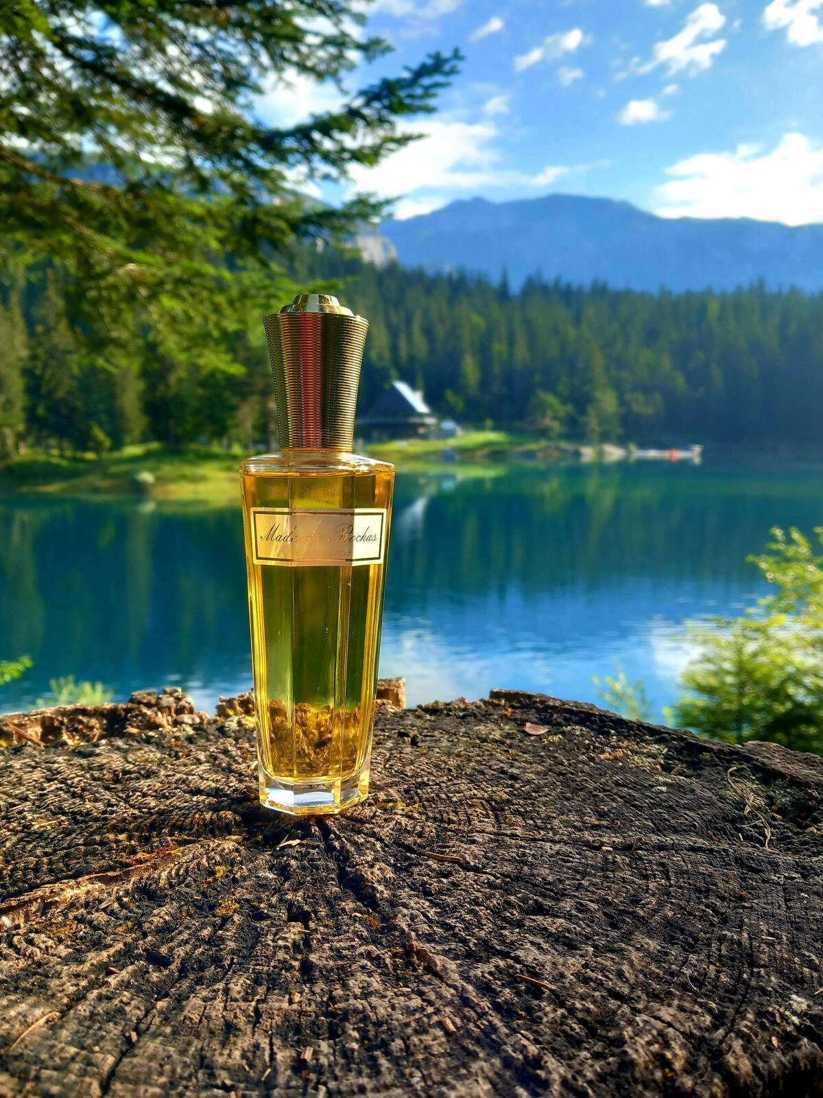 На старте композиции можно заметить жимолость, гиацинт, нероли и цитрусовые, а за ними следует нежный букет из луговых трав и цветов: роз, тубероз, ирисов и ландышей. Шлейф парфюма Madam Rochas оказался не менее уникальным и запоминающимся. Смешение мускуса, ветивера и бобов тонка завораживало всех вокруг.