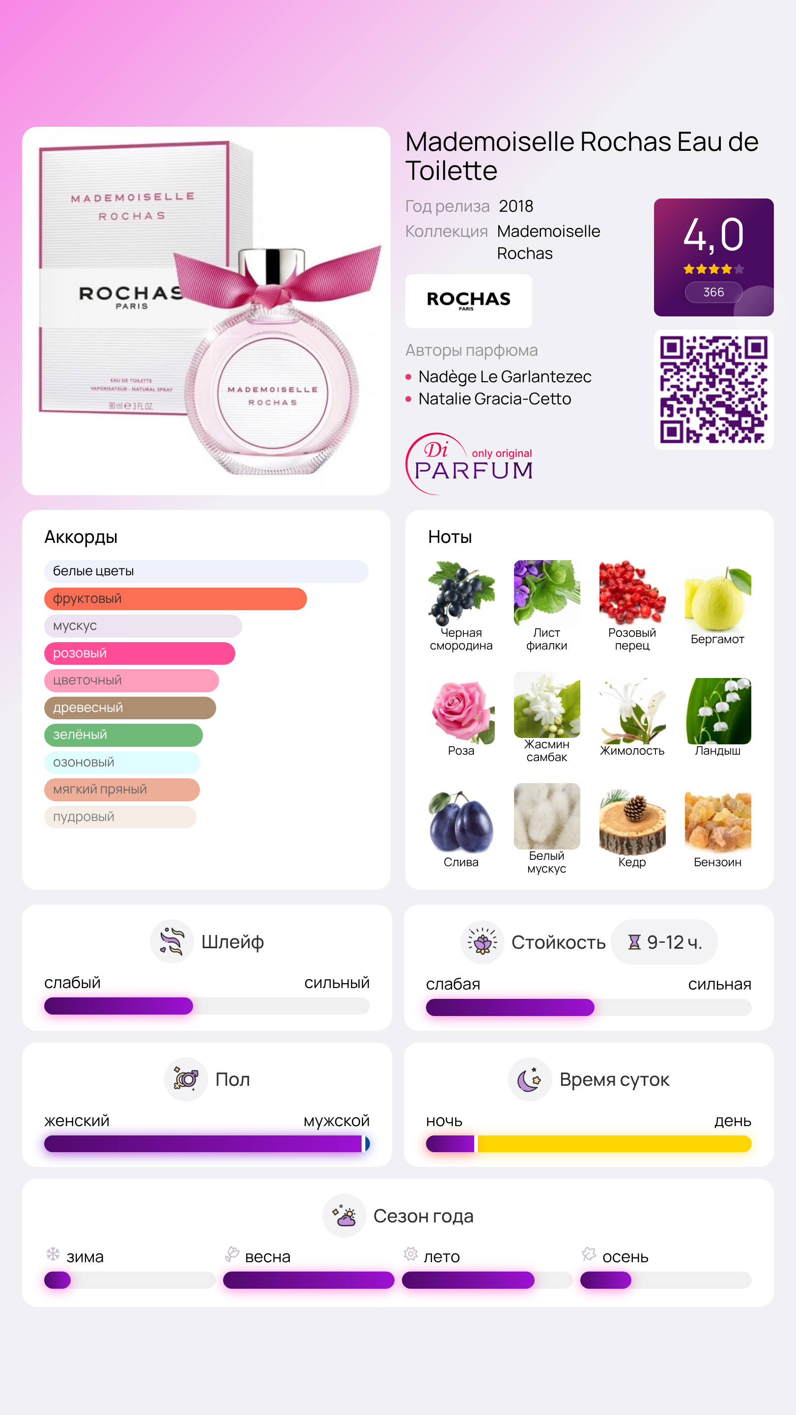 С первых нот вы сразу почувствуете восхитительное сочетание розового перца и черной смородины, которые образуют начальный аккорд. Нежное и женственное сердце композиции раскрывается в аромате розы, белых цветов и жасмина самбак. Завершающие ноты создают гармонию мускуса, бензоина и кедра, дополняя величественный букет.