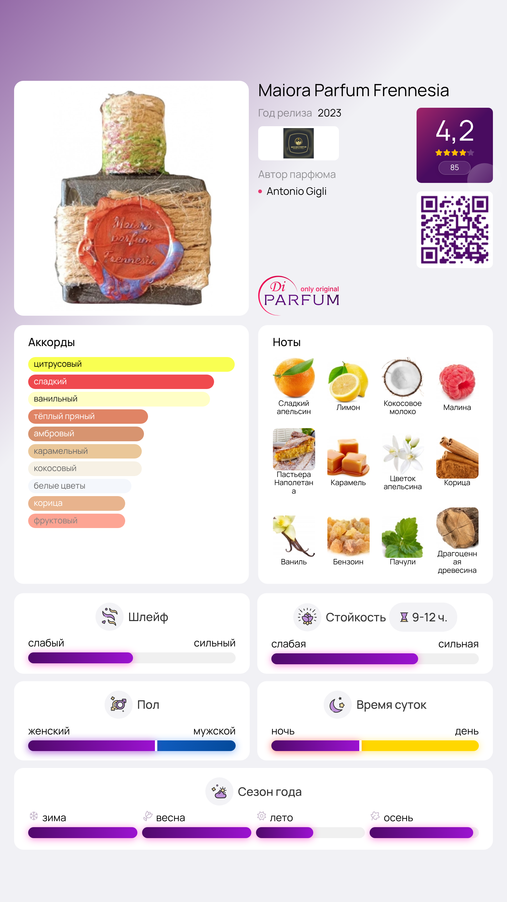 Смолистые ноты амбры и бензоина вместе с вашем мускусом создают длительный и запоминающийся шлейф Maiora Parfum Frennesia. Кажется, что, проходя мимо, вы ощутите манящий аромат маленькой неаполитанской пекарни с её аппетитными угощениями.