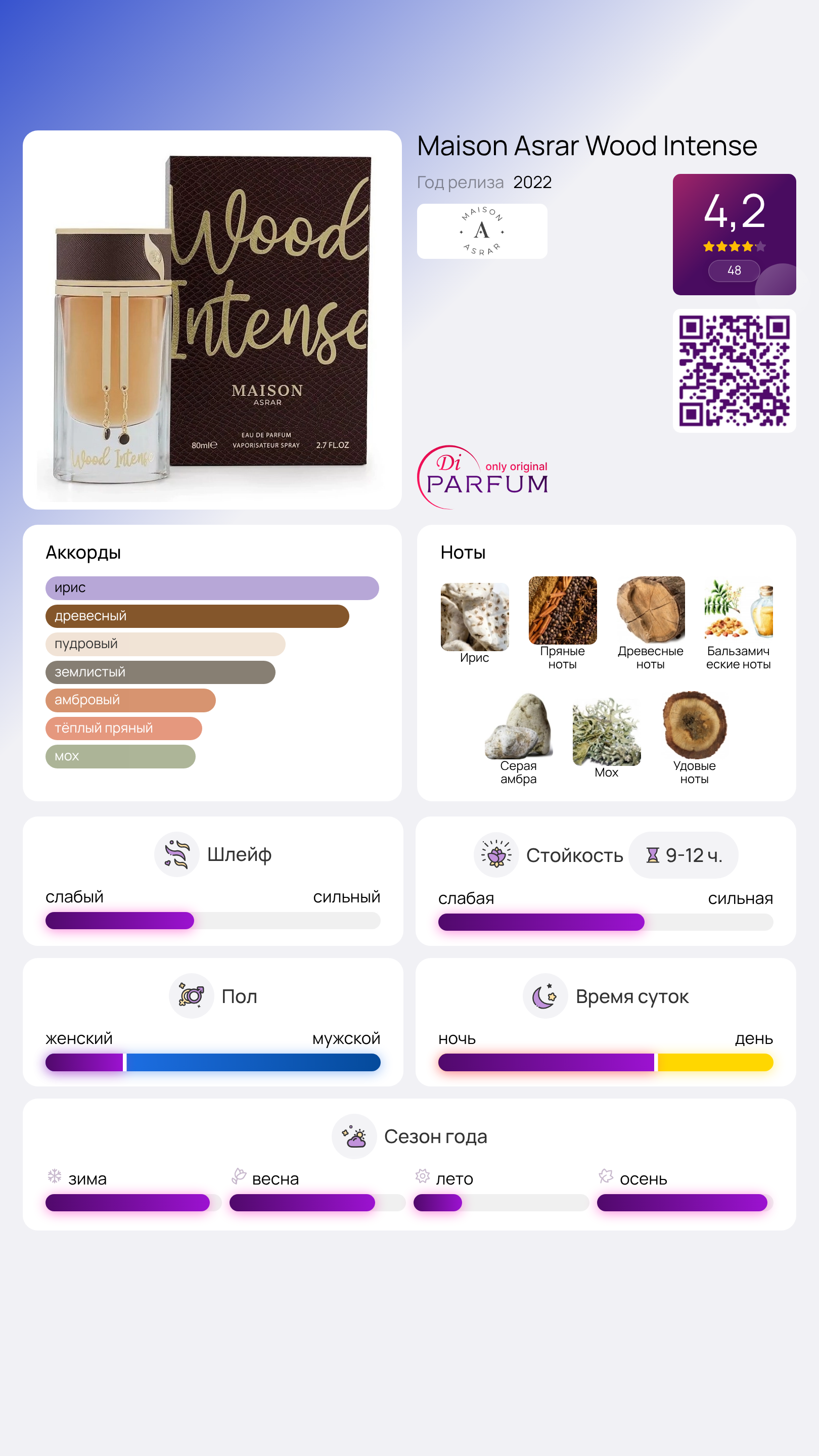 Аромат обладает яркой, теплой, слегка сладковатой нотой, которая придется по вкусу как мужчинам, так и женщинам. Приятный, успокаивающий шлейф надолго остается на коже, радуя владельца любимым запахом. Хотя аромат больше подойдёт зрелой аудитории, молодые люди также охотно выбирают подобные варианты, поэтому возрастных ограничений в этом случае нет. Позвольте себе насладиться атмосферой ближневосточной роскоши и гармонии с Maison Asrar Wood Intense.