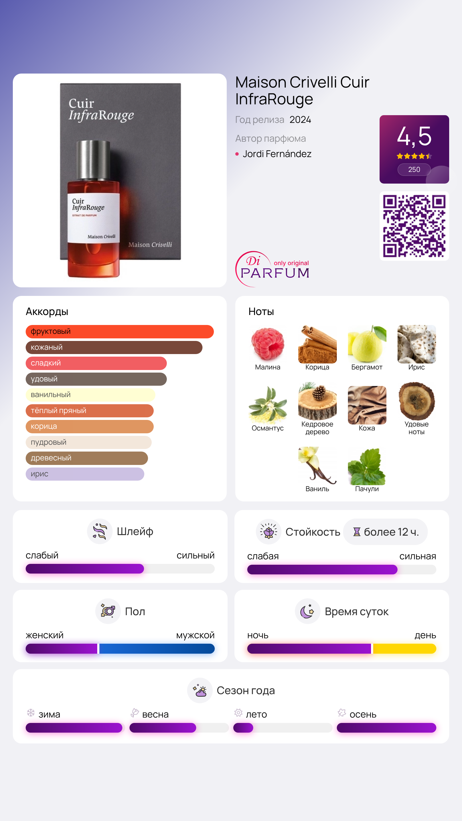 Cuir InfraRouge от Maison Crivelli – это кожаный аромат для женщин и мужчин, который был представлен в 2024 году. За его создание отвечает талантливый парфюмер Jordi Fernández. Этот новый парфюм сочетает в себе различные ноты, что делает его незабываемым.