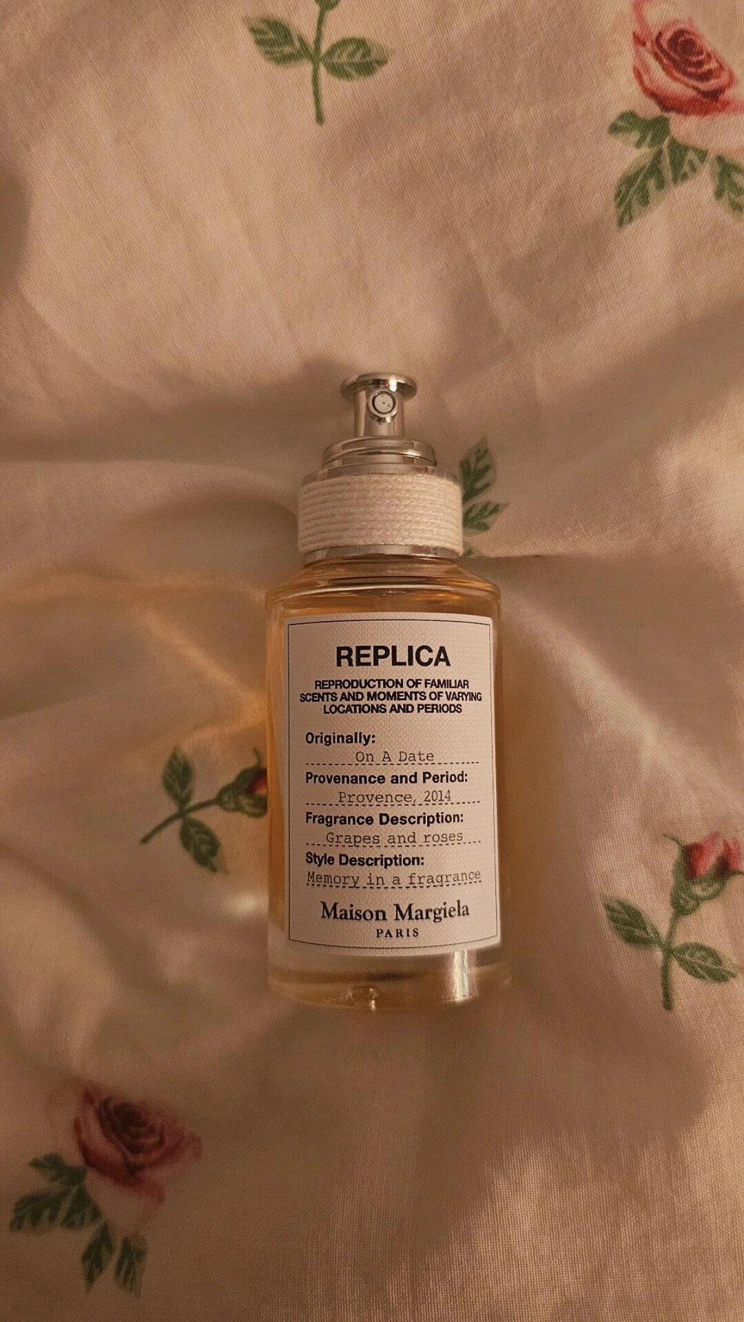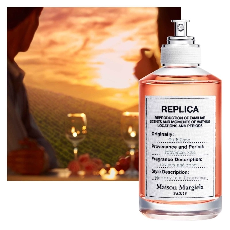 Аромат Maison Margiela On A Date с пикантными нотами цветочных и фруктовых оттенков создает атмосферу идеального романтического вечера. Основой вдохновения послужил день, проведенный в Провансе в 2014 году. Лето, вечер, воздух наполняет аромат винограда и роз. На столе стоит открытая бутылка вина, что обрамляет этот вечер, предназначенный для встречи в прованских виноградниках.