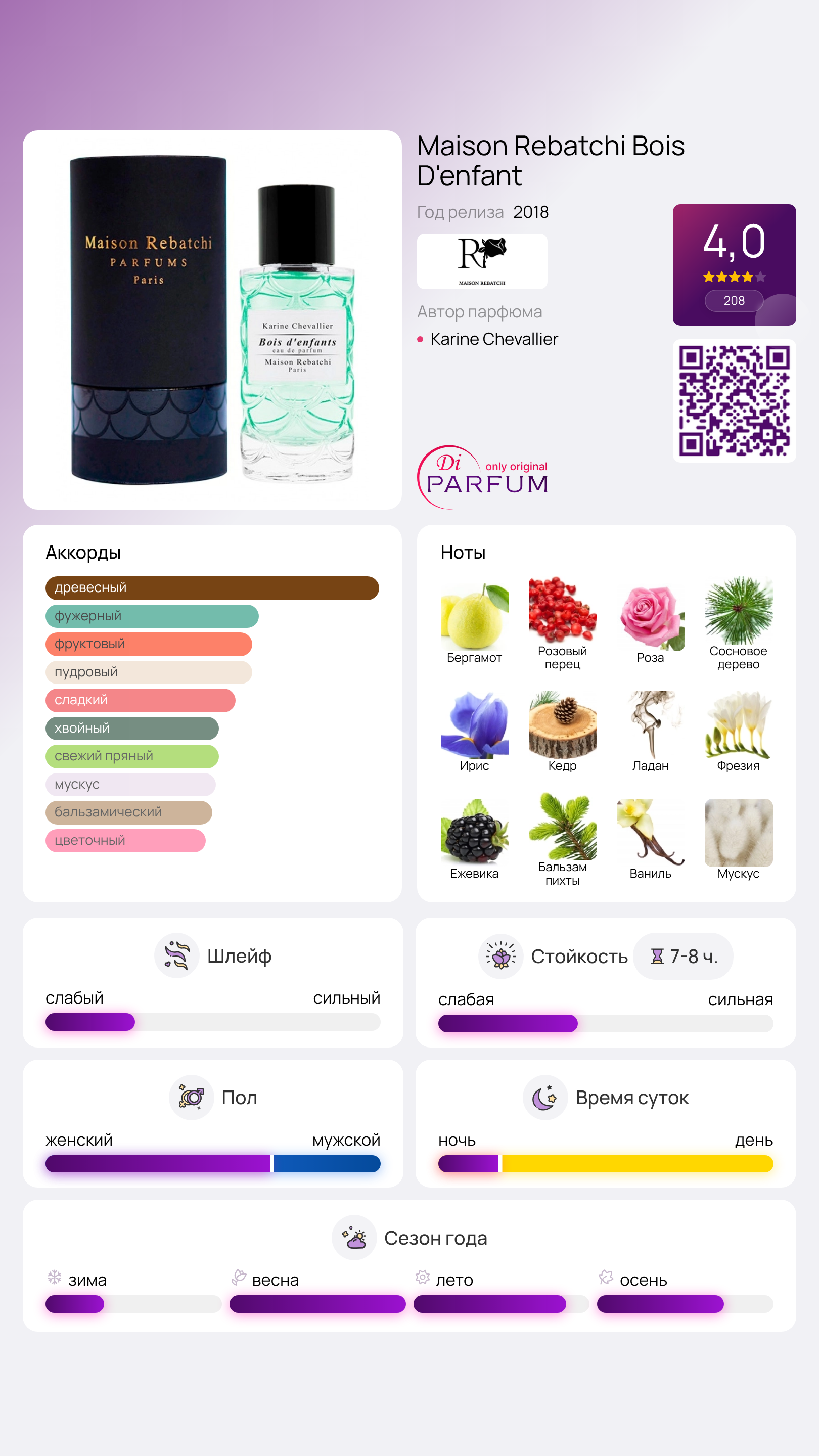 Название Bois D'enfant переводится как «Детская древесина», и этот аромат вобрал в себя детские воспоминания автора о пребывании на живописном атлантическом побережье Франции и прогулках по хвойным лесам. Встреча с нотами начинается с освежающего бергамота, пикантного розового перца и мягкого розового бархата.