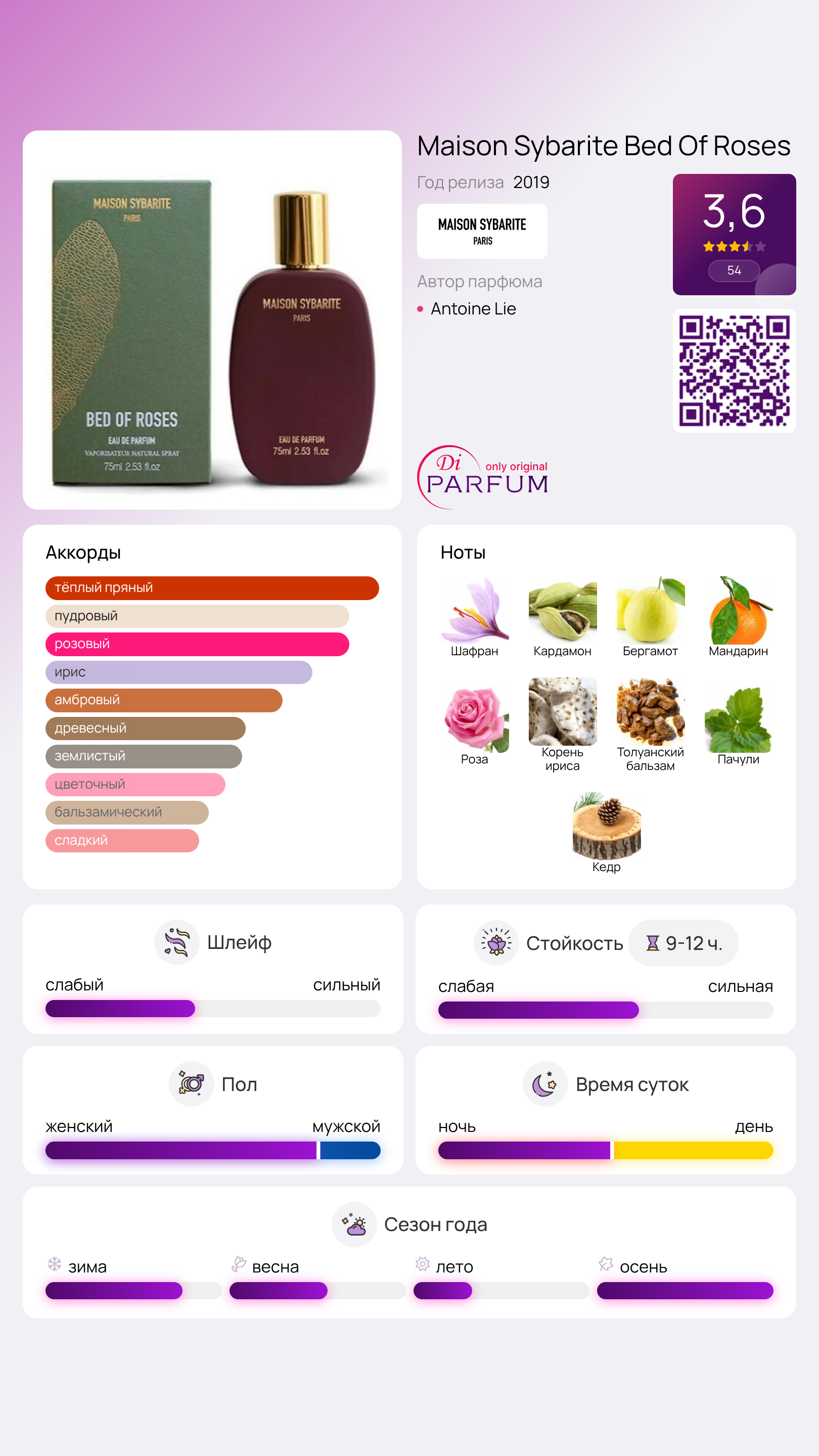 Эта композиция предлагает отвлечься от повседневных забот и сосредоточиться на себе. Инновационный аромат Bed Of Roses от Maison Sybarite – это особенные духи, которые дарят необыкновенные сенсорные впечатления. Созданные на безалкогольной основе, они раскрываются на коже, производя удивительные полутональные эффекты. Став вашим верным спутником, эта парфюмерная вода будет улучшать ваше настроение. Она была впервые презентована прогрессивным брендом на выставке TFWA в 2019 году, ознаменовав собой новый этап вдохновения и гармонии тела и души.