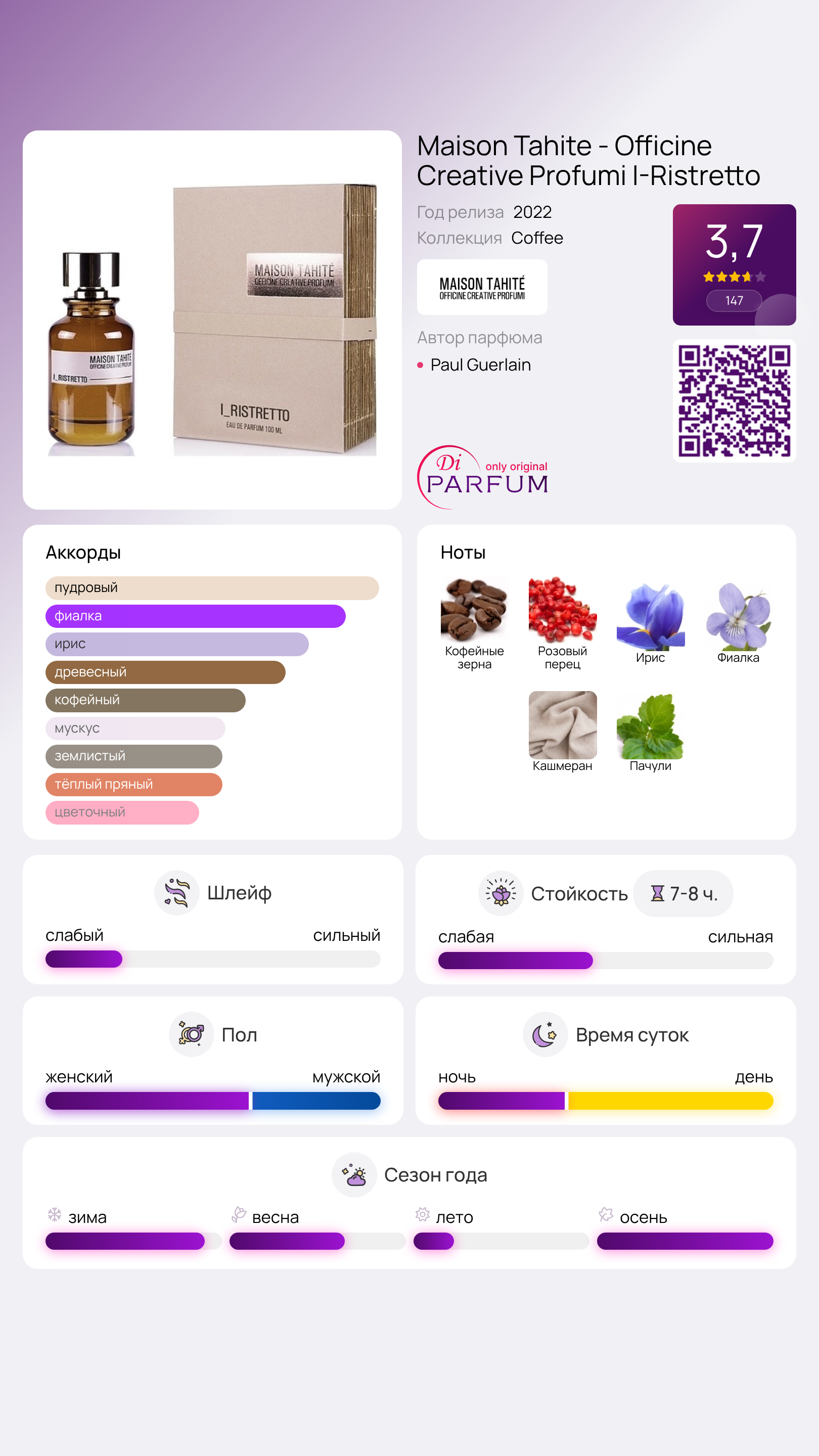 Элитный и запоминающийся парфюм I-Ristretto является произведением искусства, созданным талантливым парфюмером Полем Герленом для известного модного дома Maison Tahite - Officine Creative Profumi. Этот аромат, добавленный к линии древесно-пряных композиций в 2022 году, предлагает истинное удовольствие истинным ценителям парфюмерии. Все в нем заслуживает восхищения: от стильного винтажного флакона до прекрасно сбалансированной олфакторной пирамиды, которая активно приглашает к исследованию.