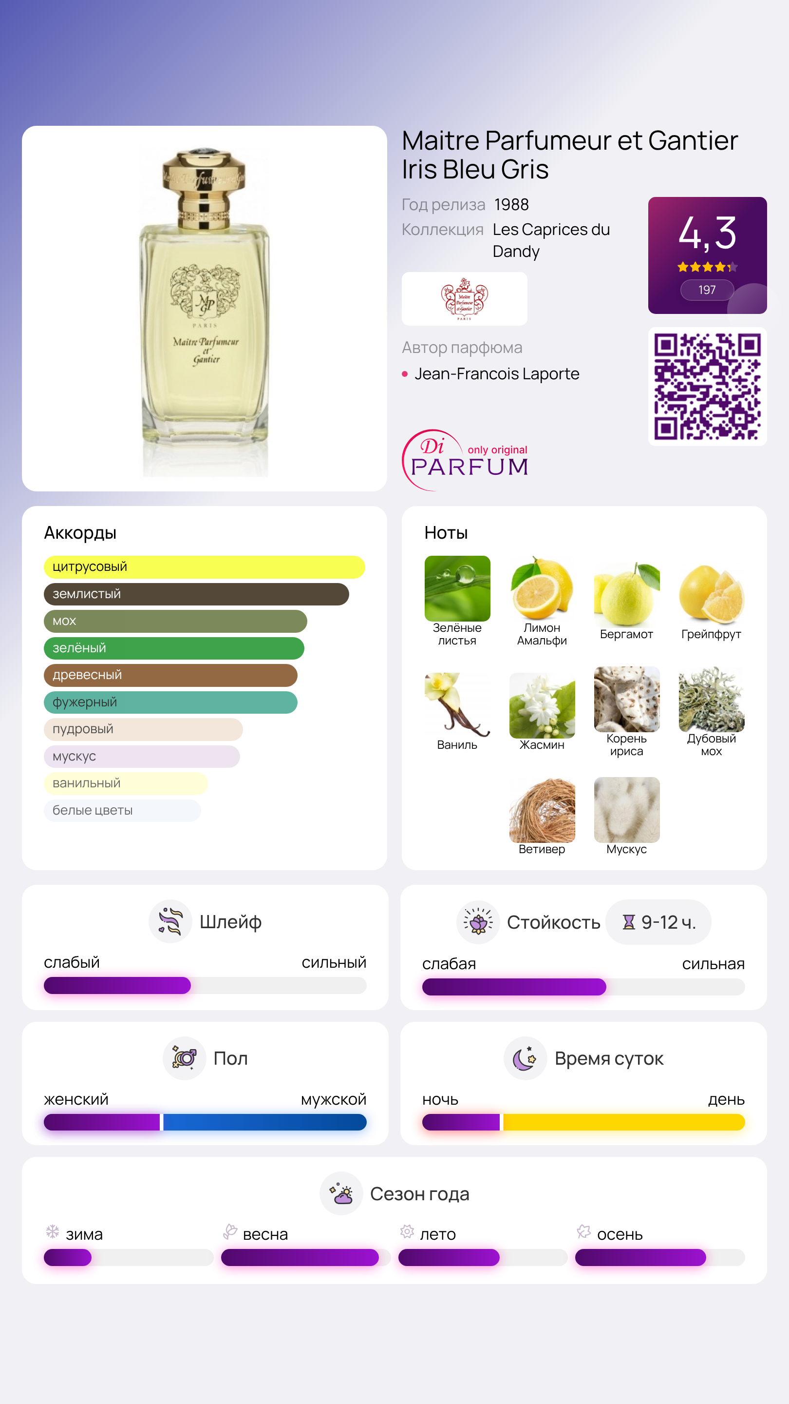 Maitre Parfumeur et Gantier Iris Bleu Gris – это обещающий цветочный и мускусно-древесный аромат для мужчин от селективного бренда «Мэтр Парфюмер э Гантье», расположенного во Франции. Изначально специализировавшийся на производстве перчаток, этот дом стал развивать парфюмерное направление, основываясь на старинных рецептах XVII века.