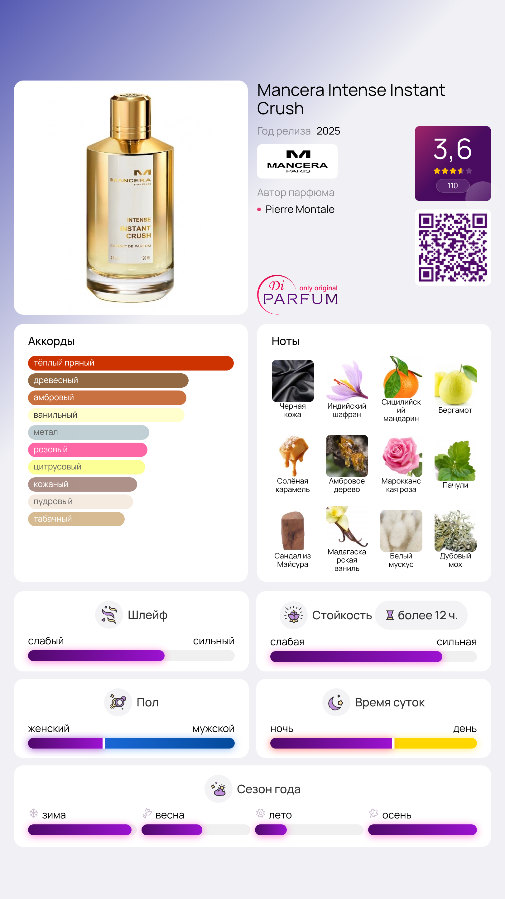 Mancera Intense Instant Crush — это парфюм, созданный в 2025 году, в котором смелая чувственность переплетается с гурманскими нотами, формируя аромат, который можно охарактеризовать как мгновение электрической сладости и чувственности кожи. Создатели этого произведения, Пьер Монталь и Амели Мансера, черпали вдохновение из瞬ного влечения, когда все внимание сосредоточено на одном взгляде, а время словно замирает. Этот аромат вызывает атмосферу рискованного соблазна, как в полумраке бара, где кожаная мебель, звуки тиков и сладкие нюансы карамели объединяются в единое целое.