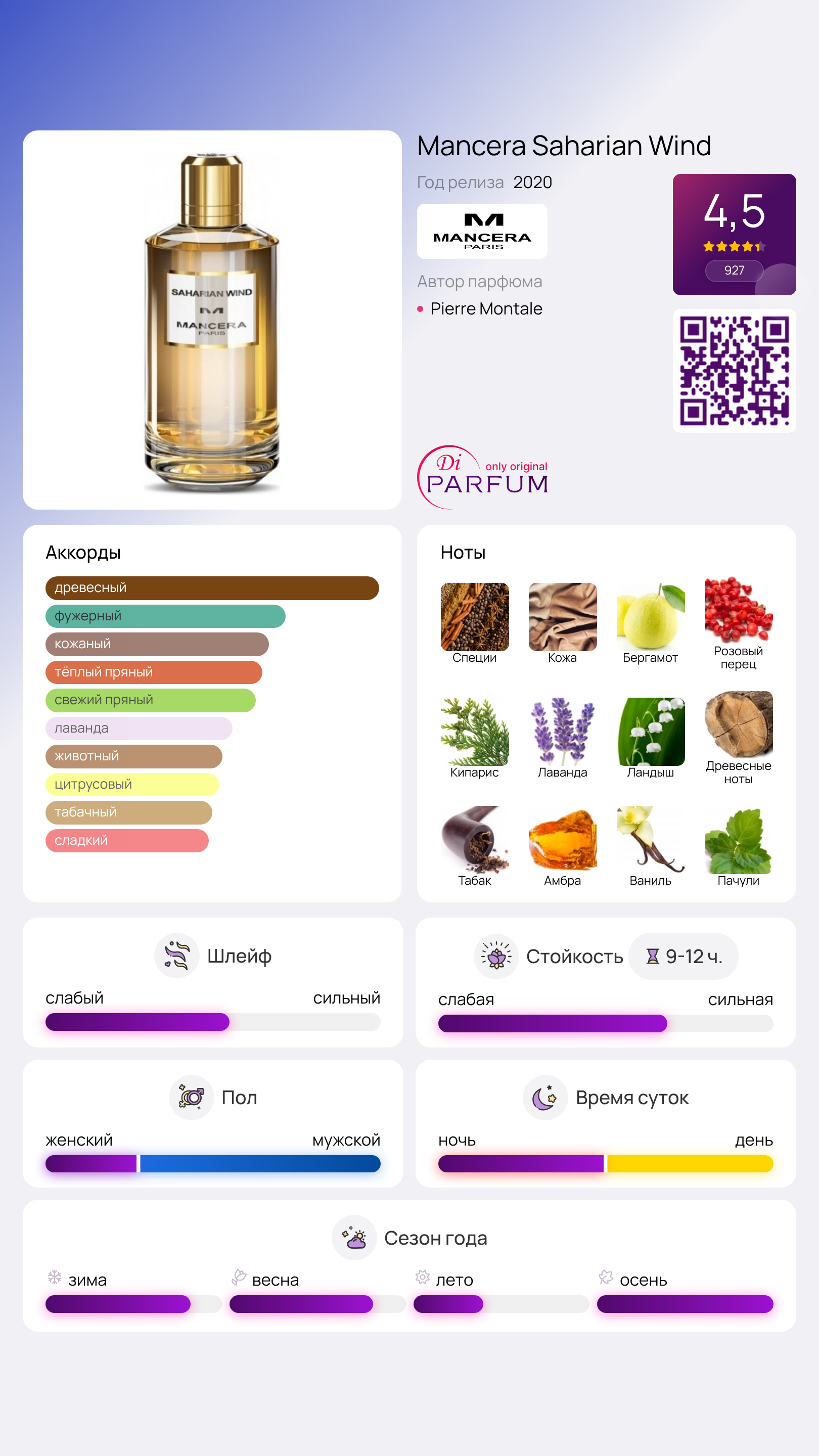 Красота экзотических древесных акцентов подчеркивается дымным красным табаком. В финале, насыщенные искры белого мускуса объединяются с мягкостью соблазнительной ванили и восточной амбры. Композиция Saharian Wind от Mancera представляет собой глубокий, насыщенный унисекс-аромат с анималистичными нотами. Он передает ощущение достоинства и вечной безупречности. Этот эликсир символизирует путь к удивительным открытиям, в ходе которого ощущается естественный аромат бархатистой, раскаленной под солнцем кожи.