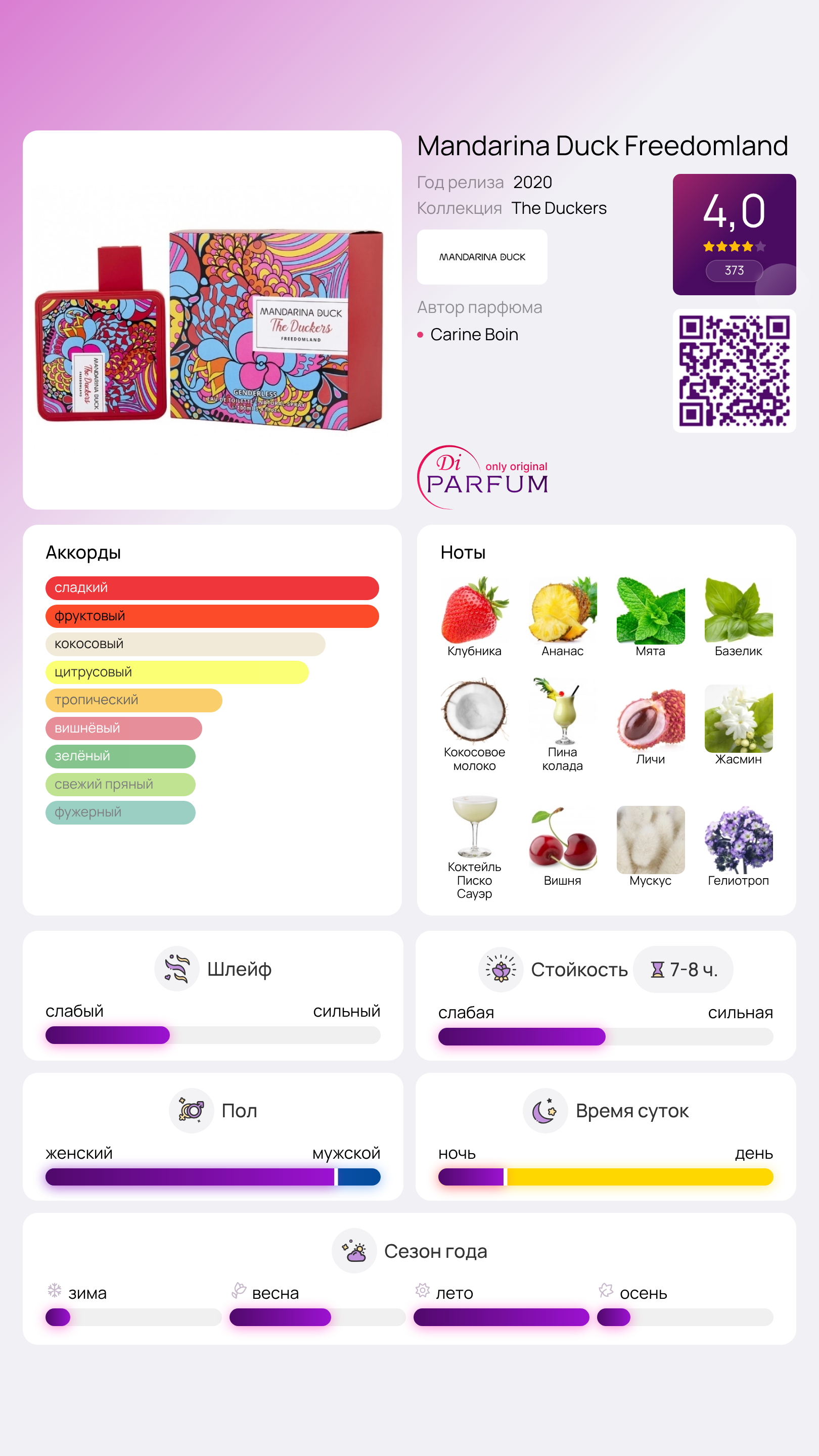 В шлейфе звучит еще один ароматный коктейль - писко сауэр с кисловатыми ягодами насыщенной вишни. Травянистый гелиотроп контрастирует с теплым и соблазнительным мускусом. Композиция Freedomland от Mandarina Duck создает атмосферу музыкального фестиваля, с его яркими ритмами и цветами, позволяя окунуться в беззаботное летнее настроение!