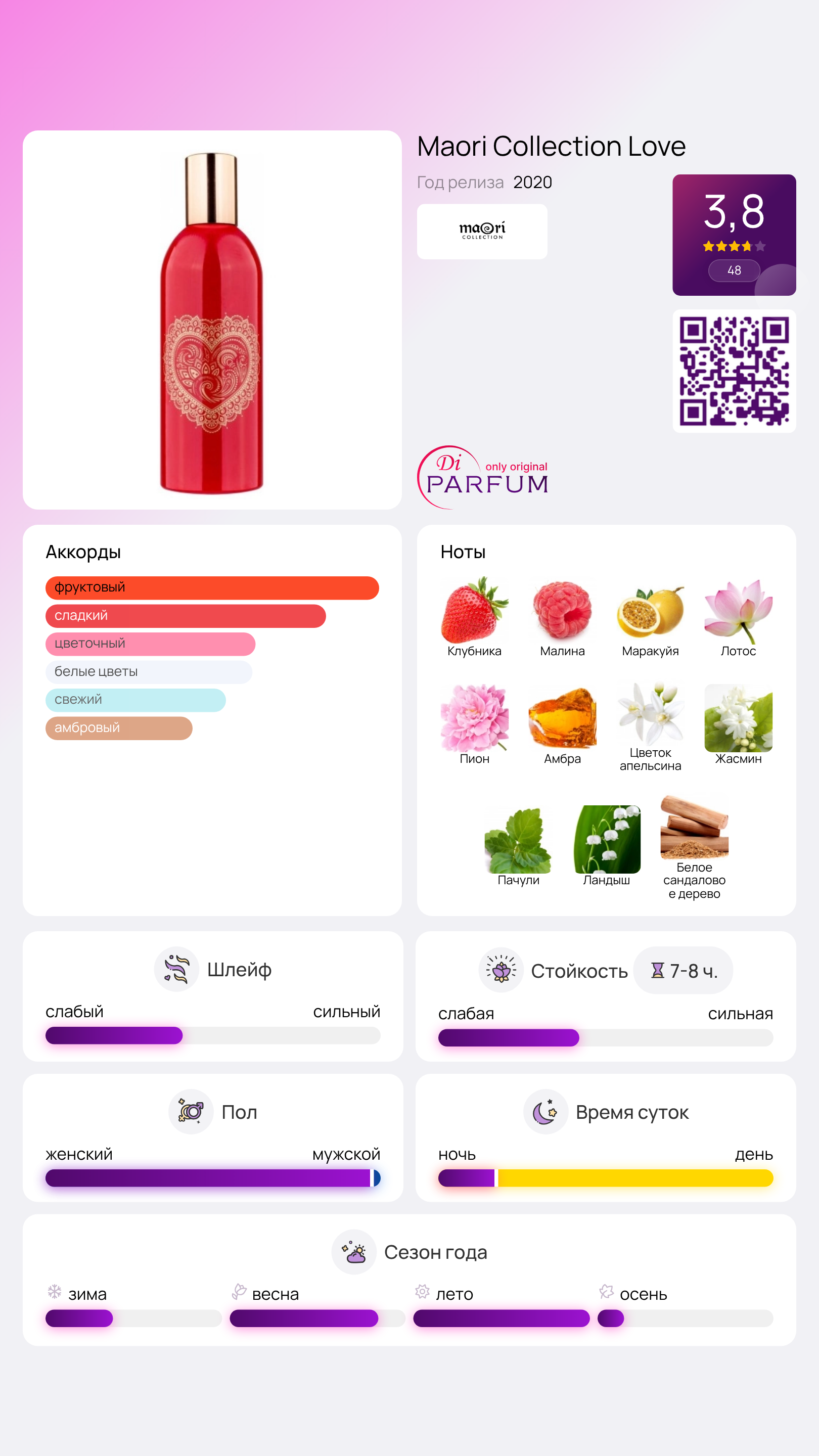 Известный ароматерапевт Паоло Теренци стал автором этой композиции и других произведений бренда. Он выразил чувства любви, сочетая сладкие, фруктовые и яркие цветочные ноты. Начало аромата открывается фруктовой сладостью, где можно уловить ноты клубники, малины, экзотической маракуйи и медвой груши. Сердце аромата наполнено цветочными нюансами флердоранжа, нежного ландыша, пьянящего пиона, душистого жасмина и утонченного лотоса с выразительным сладким акцентом. Завершающие ноты представляют собой теплую амбру, землистые пачули и бархатистый сандал.