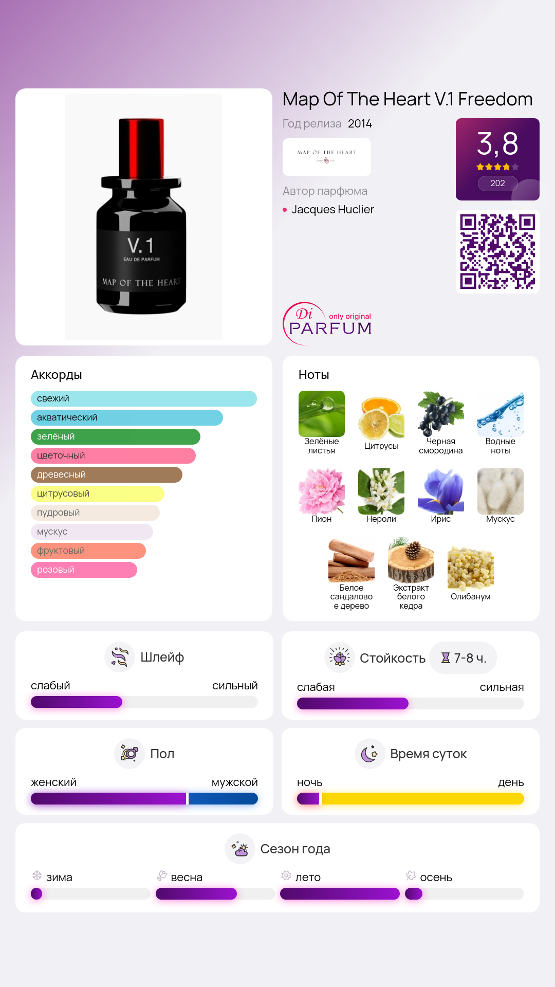 Шлейф аромата состоит из нежного белого кедра и сливочного австралийского сандала, создавая обворожительное звучание. Драгоценная древесина окутана легким облаком редких благовоний вместе с соблазнительным мускусом. Презентация V.1 Freedom от Map Of The Heart состоялась в 2014 году и вошла в коллекцию, призывая людей быть собой и не притворяться. Элегантный черный флакон с темно-красным колпачком украшает знаковый символ сердца.