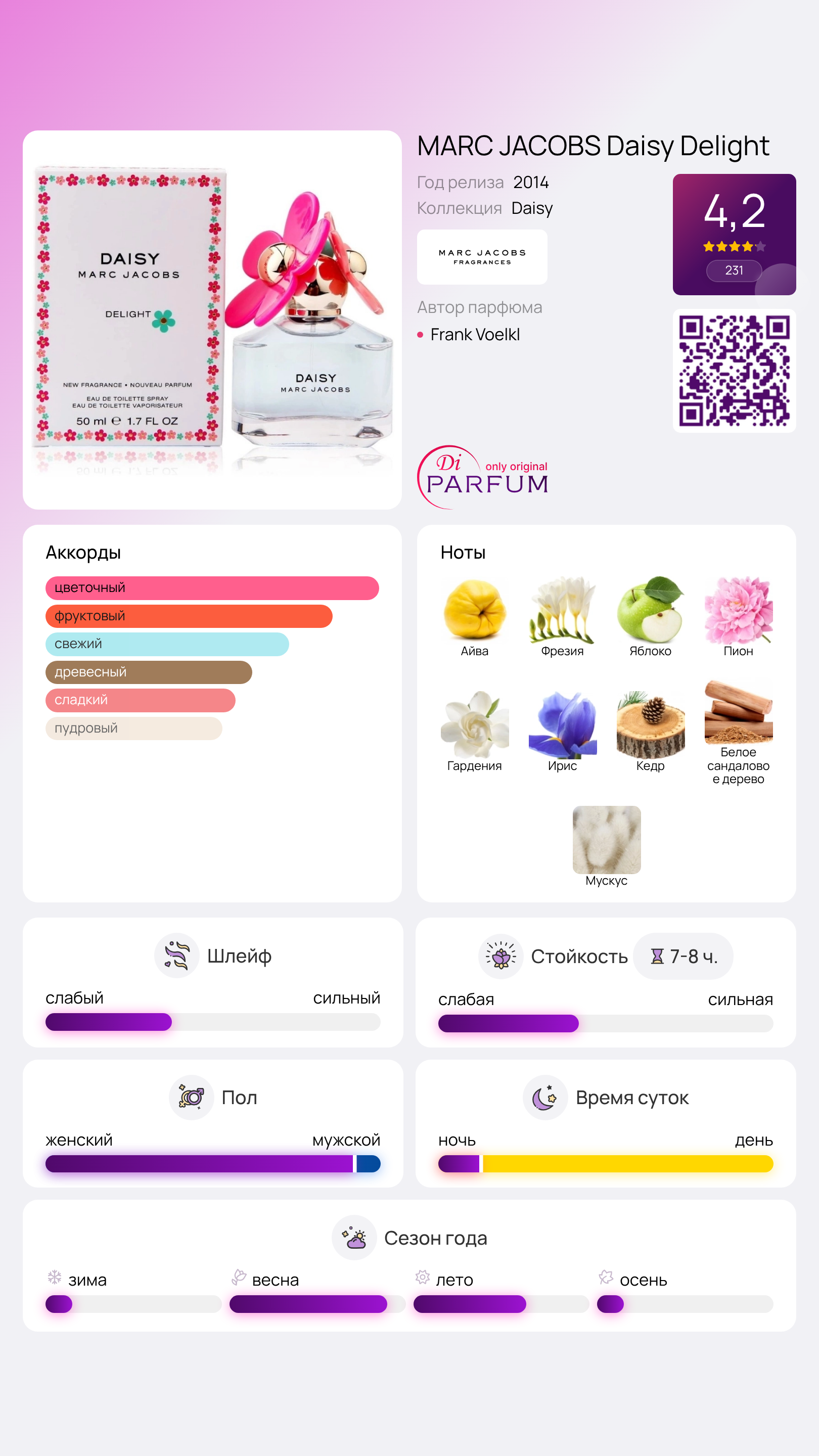 В 2014 году Дизайнерский Дом Marc Jacobs, оставаясь верным своим корням, презентовал аромат Daisy Delight, который в очередной раз воплотил в себе женственность и позитивный настрой.