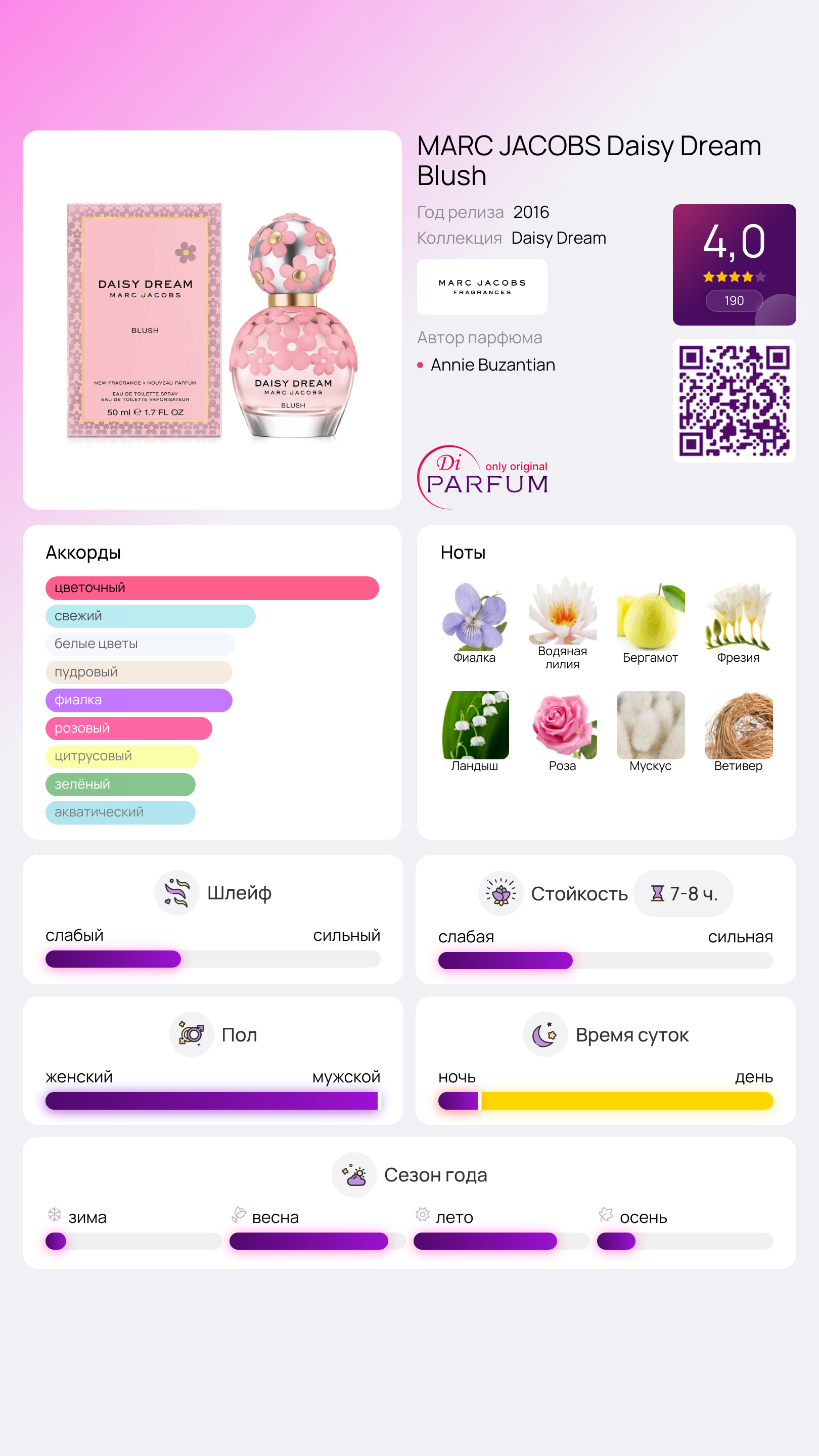 Daisy Dream Blush – это женский парфюм с цветочной композицией, представленный брендом Marc Jacobs в 2016 году. Учитывая, что аромат в жаркую погоду может изменить свое восприятие, парфюмер Анни Бузантиан выбрала простые и понятные ноты для создания летнего букета.
