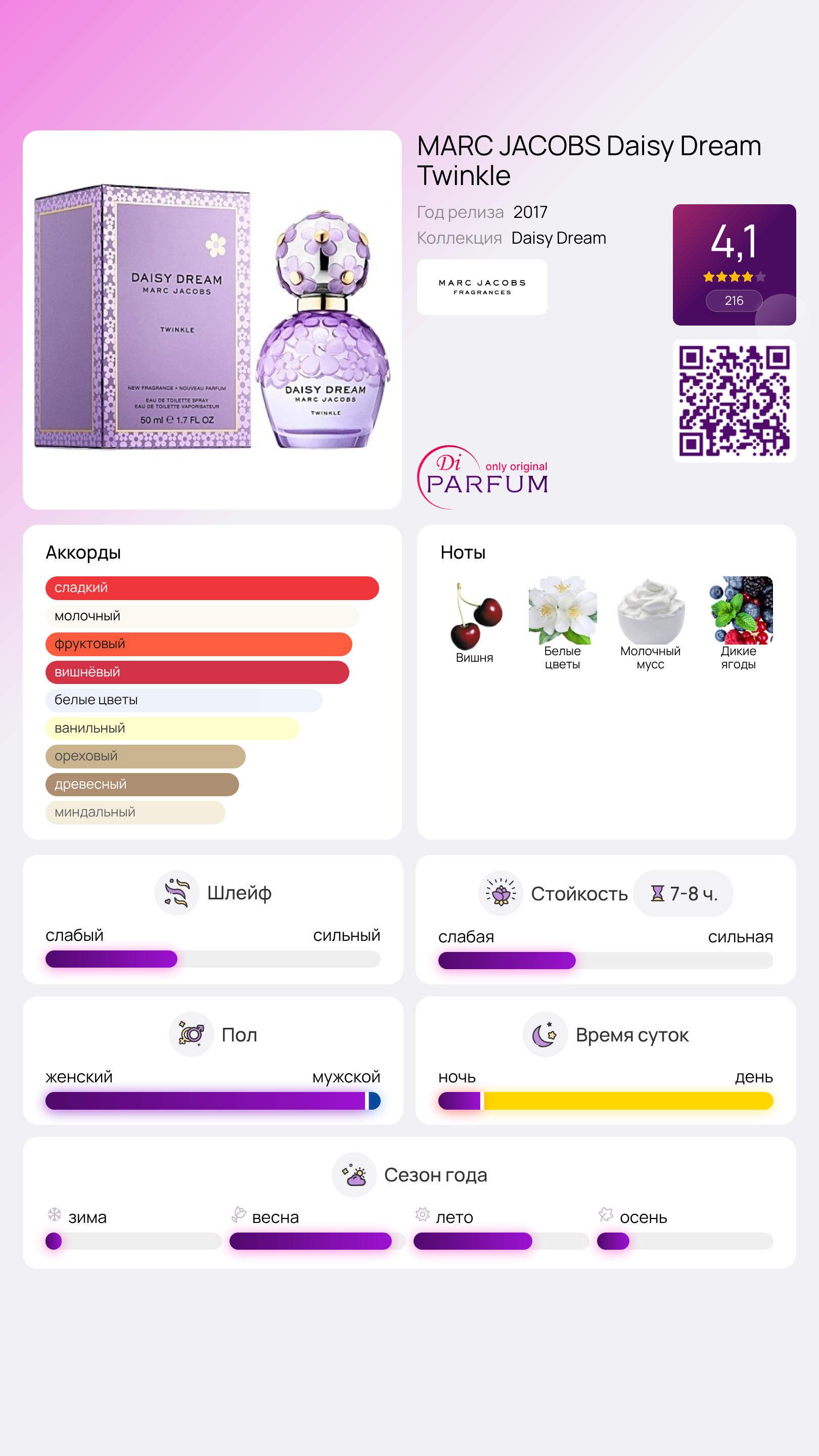 Дом моды Mark Jacobs представил несколько новых ароматов, вдохновленных фиалкой, и среди них выделяется цветочно-фруктовый Daisy Dream Twinkle. Элегантный флакон с великолепным оттенком и утонченным дизайном привлекает внимание. Аромат получился легким, свежим и простым, идеально подходящим для летних дней. В начале раскрытия преобладает нота спелой вишни, хотя её звучание не слишком яркое. Основное внимание переключается на сердцевину аромата, где можно различить ароматы белых цветов. В верхних нотах присутствует сладкий молочный мусс и лесные ягоды, но фиалка, хотя и не указана в структуре, вдохновила на создание этой композиции.
