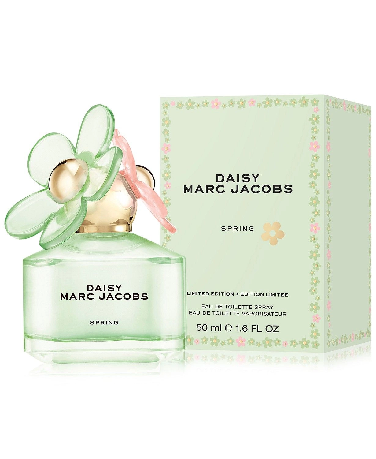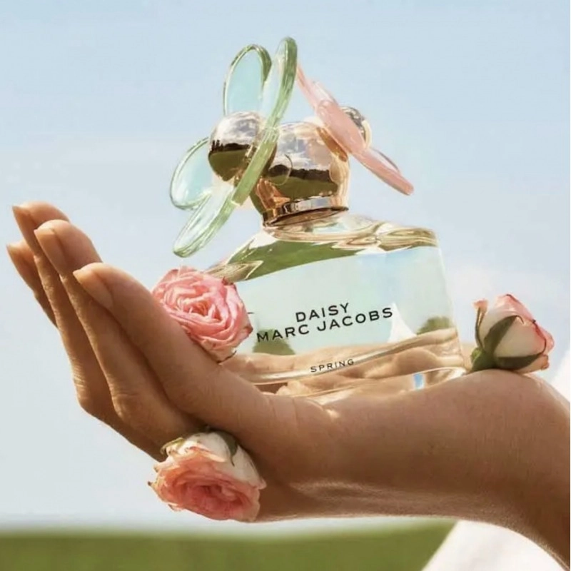Флакон духов MARC JACOBS Daisy Spring имеет светло-зеленый цвет и украшен двумя очаровательными цветами в нежных розовых и зеленых оттенках, которые подчеркивают цветочный и свежий характер этого аромата.