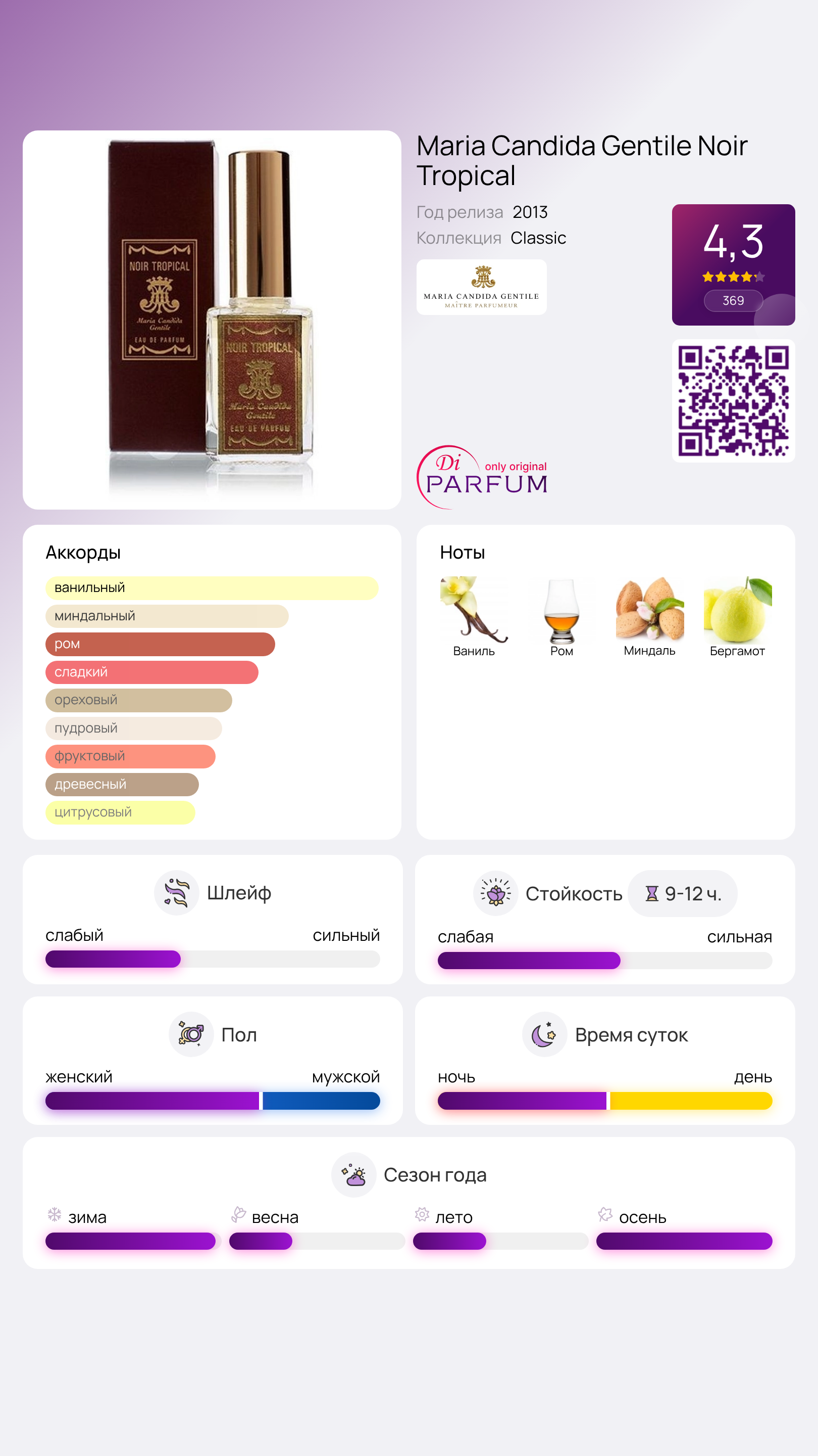 Ароматический эликсир Maria Candida Gentile Noir Tropical представляет собой притягательную и в то же время легкую фантазию, которая погружает в атмосферу жаркой южной ночи. Созданный парфюмером, этот аромат собрал в себе лучшие моменты звучания редких нот. Введённый в коллекцию итальянского бренда в 2016 году, он раскрывается через удивительную натуральную ваниль с пряными нюансами.