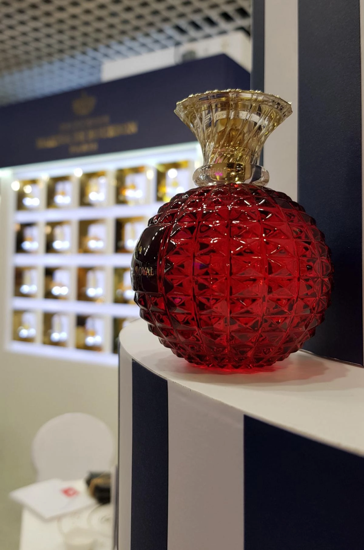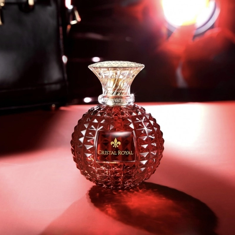 Флакон с изысканным дизайном, украшенный геральдикой королевской семьи, сверкает рубиновым хрусталем, подчеркивая роскошь и утонченность этого аромата.