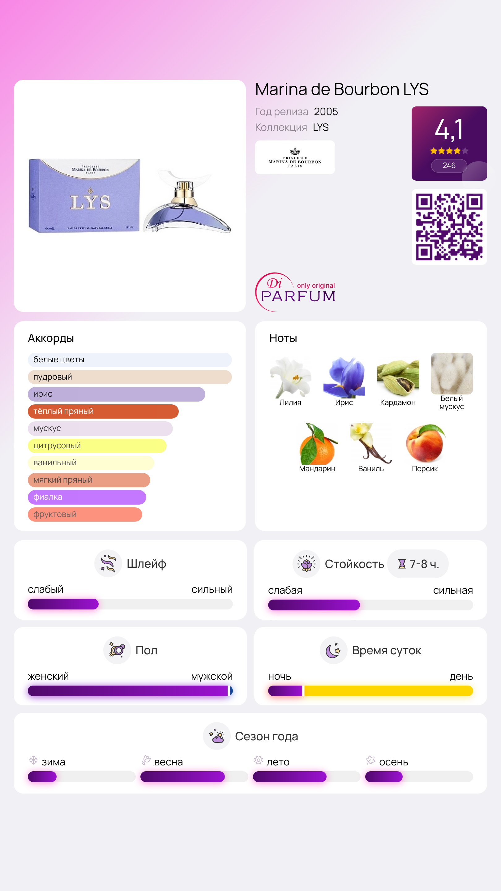 Ноты, такие как белый мускус и ваниль, ирис и кардамон, лилия и персик, мандарин, создают потрясающую композицию. Эта божественная палитра ощущений волнует и освежает, обольщает и возбуждает!