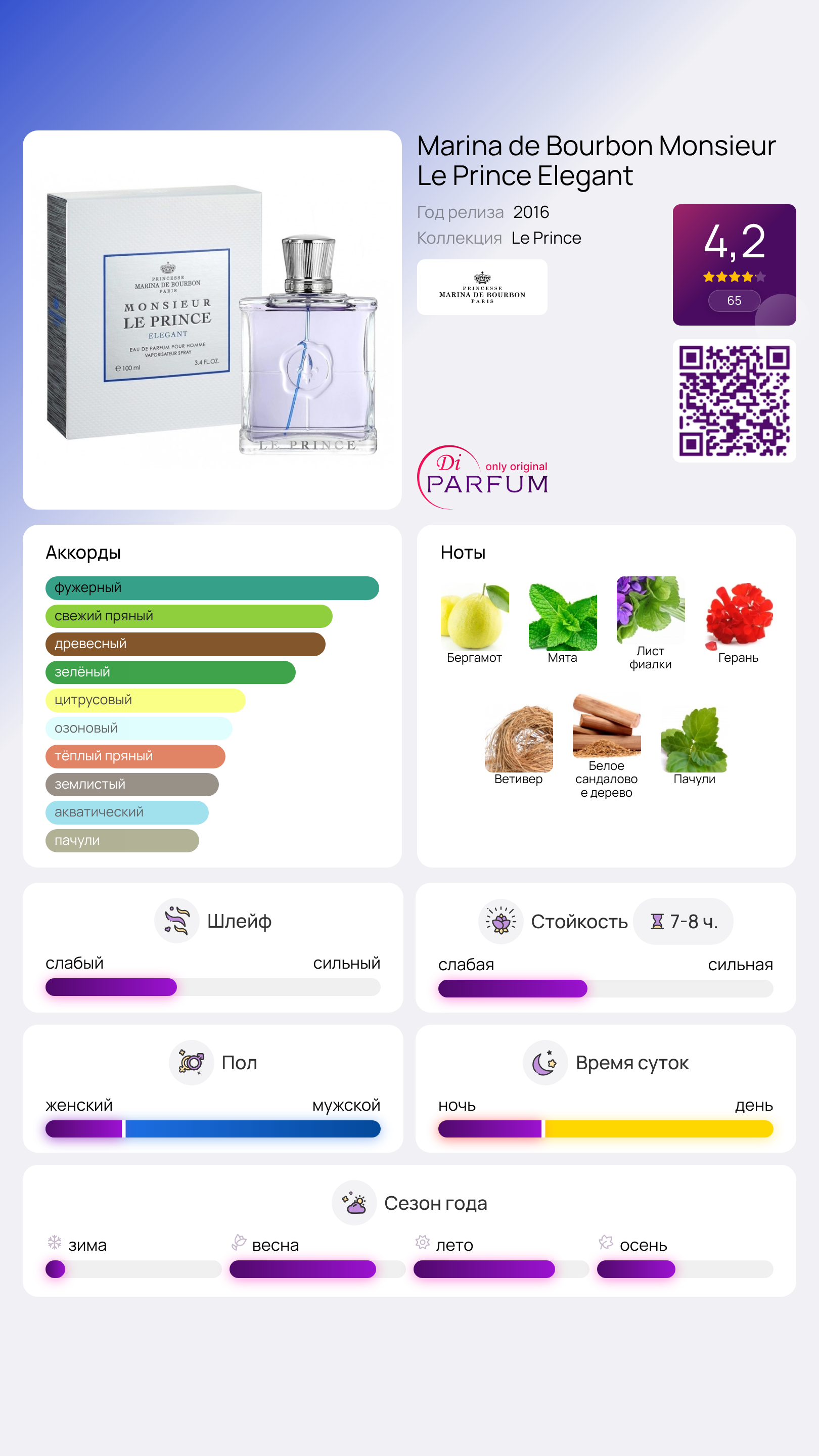 Композиция Monsieur Le Prince Elegant от Marina de Bourbon излучает респектабельность и подчеркивает индивидуальность своего владельца. Этот парфюм создан французским брендом, основанным представительницей королевской семьи, и предлагает своим обладателям носить ароматы с тем же достоинством, с каким носят царственные наряды, позволяя смотреть на мир с высоты своего статуса.