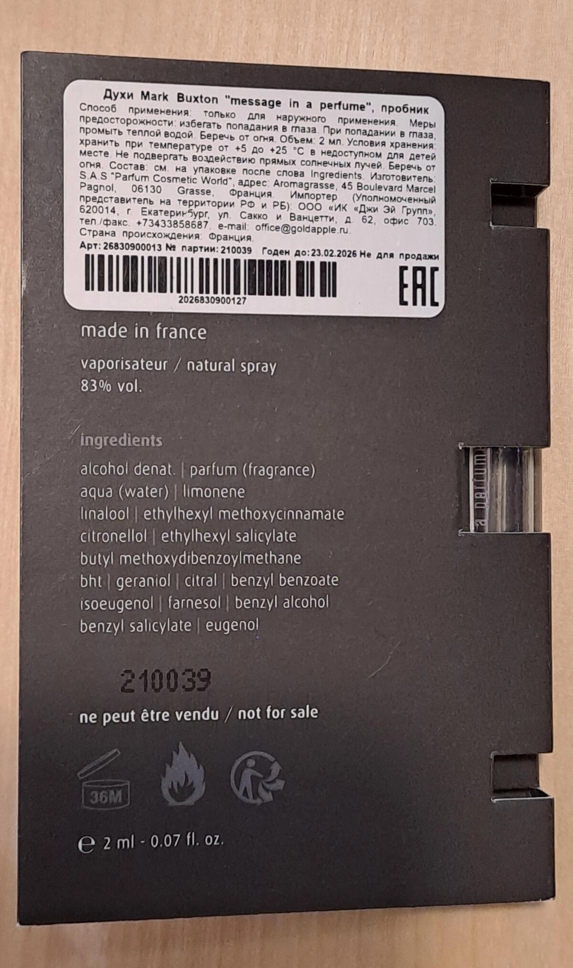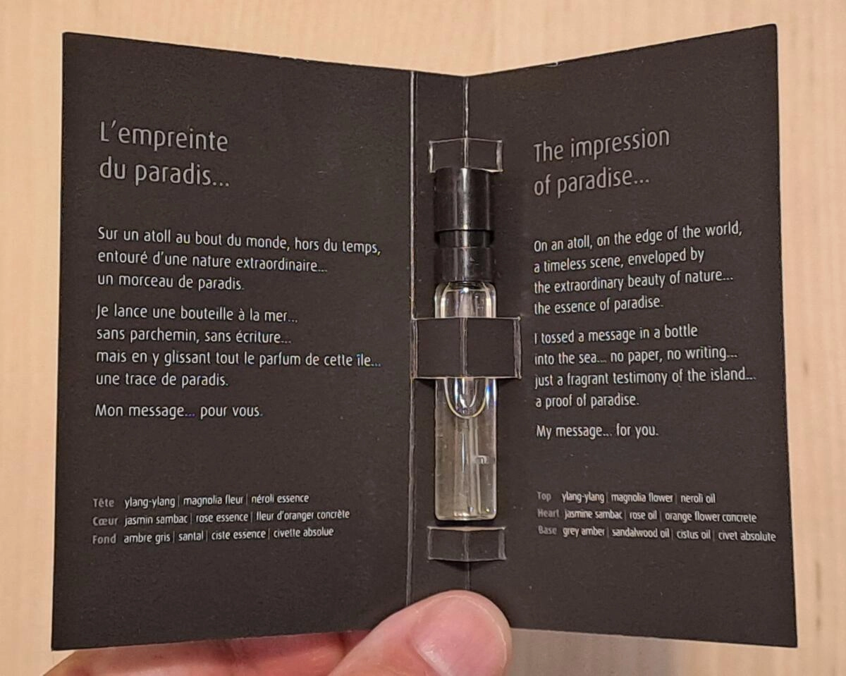 Аромат представляет собой не просто комбинацию компонентов; это истинное послание, доступное для восприятия только настоящим ценителям. Знаменитый французский парфюмер Mark Buxton назвал своё новое произведение Message in a Perfume, что переводится как «послание в парфюме». Он поделился со слушателями своим внутренним состоянием и собрал все свои чувства в изысканном цветочном букете.