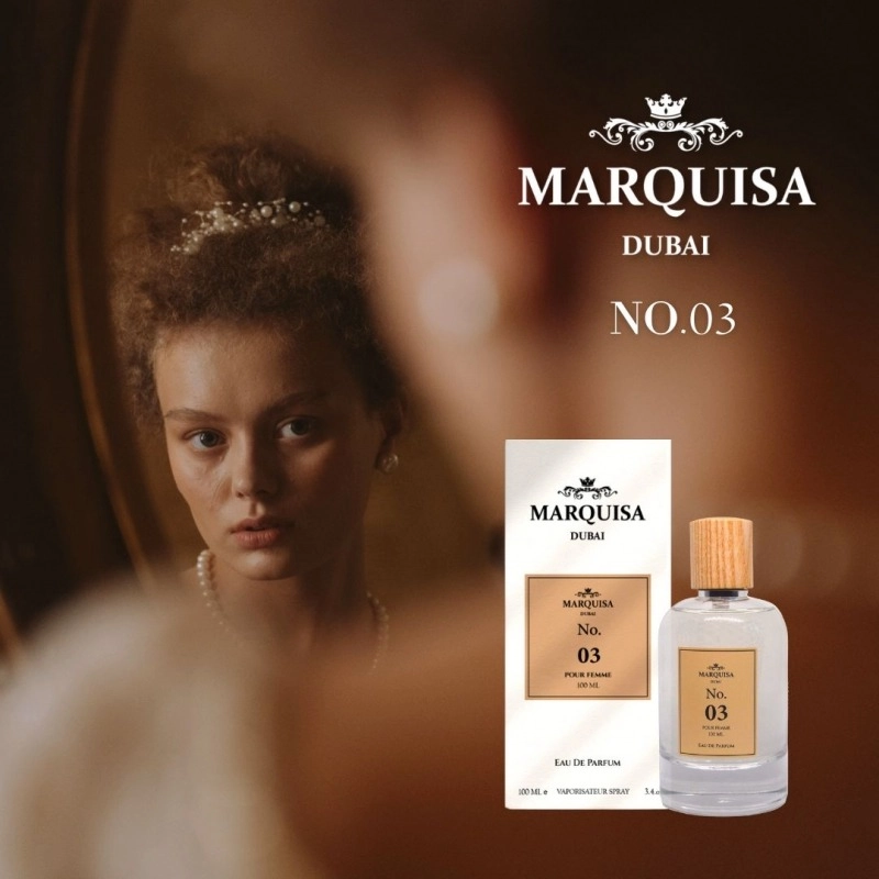 Завораживающий ванильный шлейф, окруженный обольстительным белым мускусом, маслянистым тиковым деревом и пряными пачулями, добавляет глубины и элегантности. Аромат No. 03 Pour Femme от Marquisa Dubai вызывает ассоциации с летними прогулками по средиземноморскому побережью. Парфюмерное творение было представлено в 2023 году в рамках «нумерованной коллекции», а лаконичный флакон украшен колпачком светлого древесного оттенка.