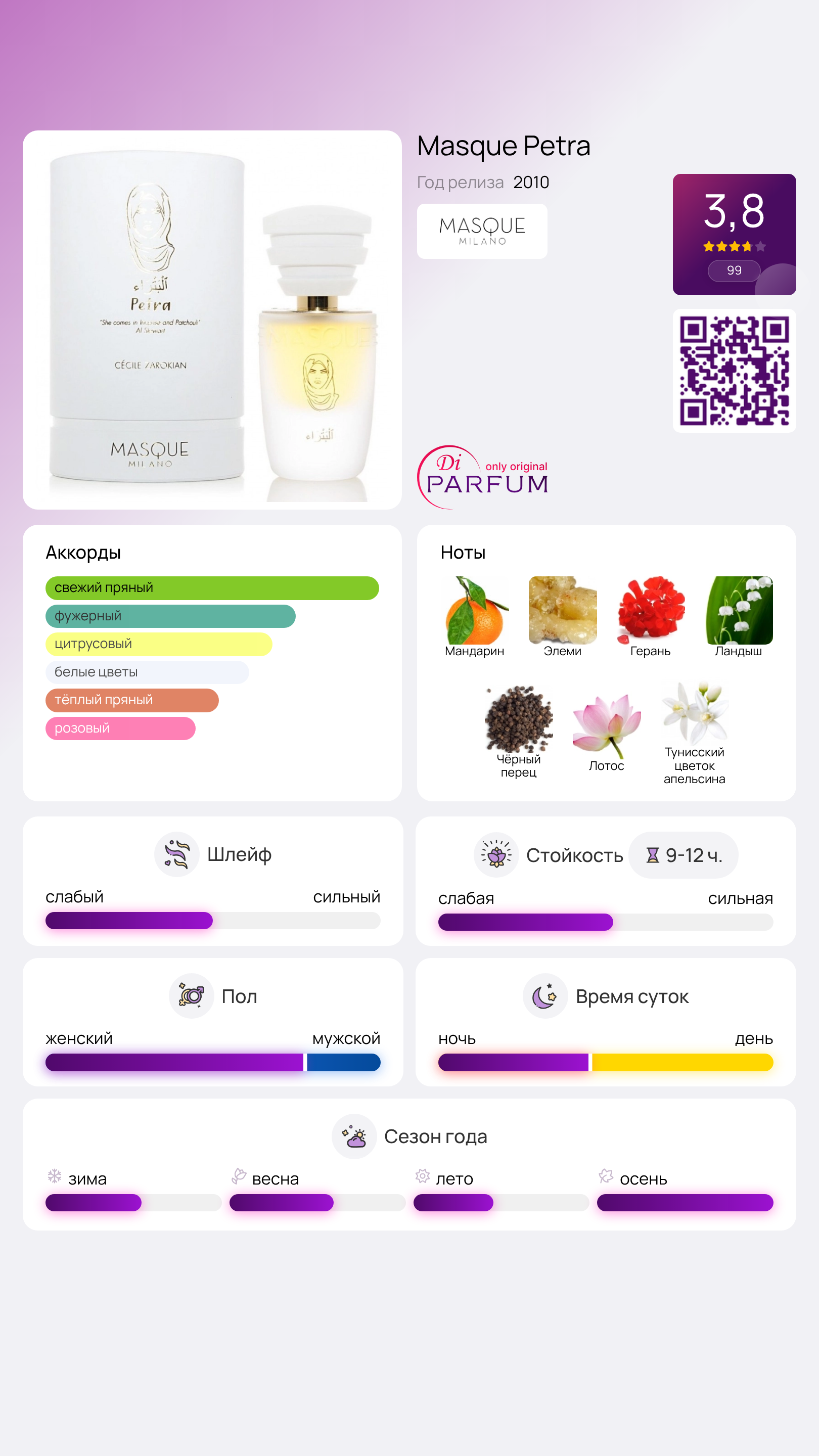 В финале Masque Petra оставляет на коже мускусную ноту терпкости, дополненную тонкими оттенками серой амбры и волнительными всплесками бензоина, покрытыми камфорной пылью пачулевых листьев.