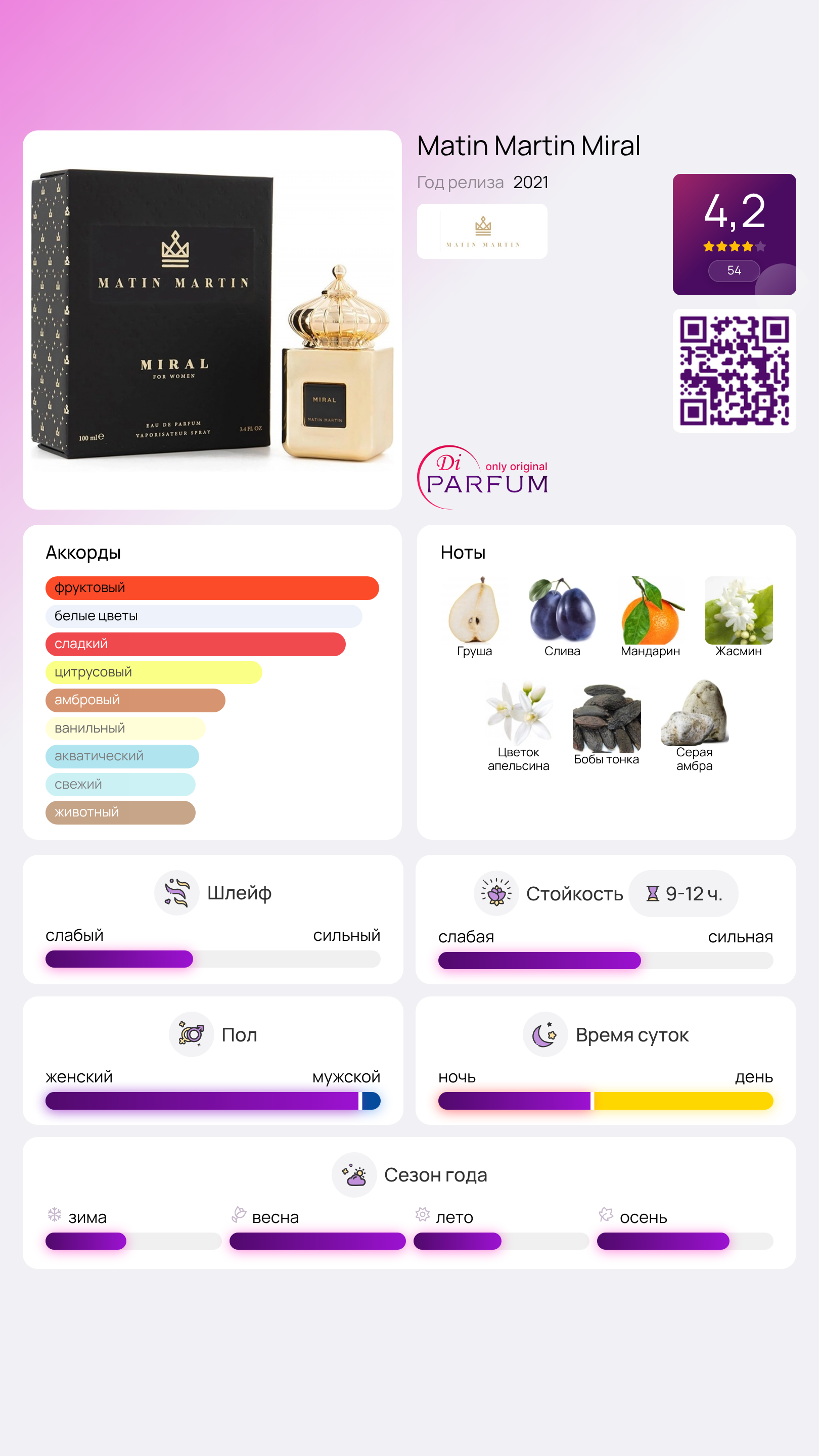 MIRAL EAU DE PARFUM от Matin Martin – это утончённый восточный фужерный аромат, созданный для женщин, стремящихся подчеркнуть свою индивидуальность. Дебютировав в 2021 году, этот парфюм быстро завоевал популярность благодаря своей уникальной композиции.