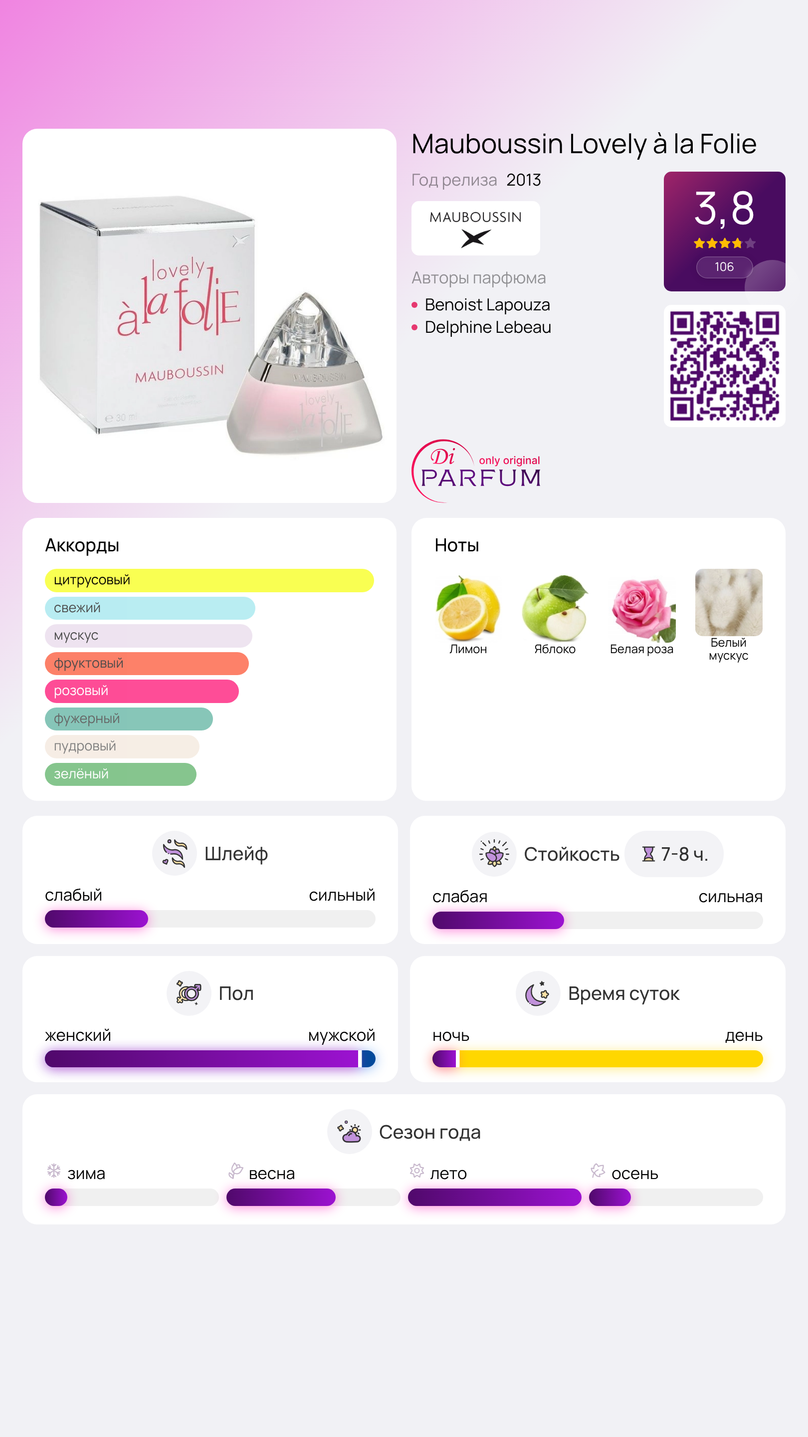 Парфюм Mauboussin Lovely à la Folie создает атмосферу, в которой кажется, что бесконечное счастье реально. Выпущенный в 2013 году, этот аромат отличается своей простотой и элегантностью, что способствует его популярности среди ценителей. Первая нота раскрывается свежим, ярким лимоном, за которым следует гармоничное сочетание яблока и розы. В качестве завершающего аккорда мастера парфюмерии выбрали мускус. Этот запах идеально подойдет для девушки, которая стремится к насыщенной и яркой жизни.
