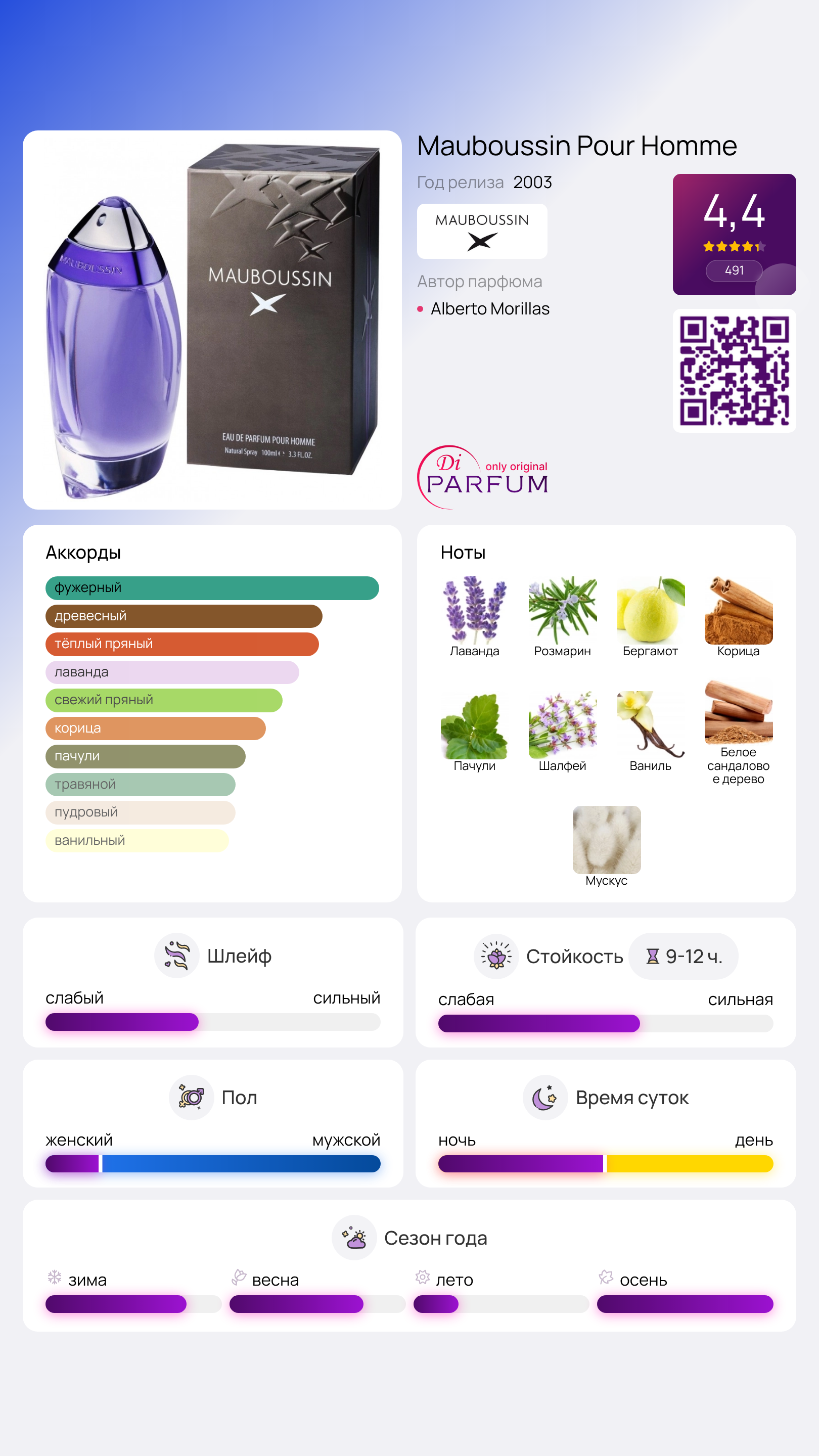 Невозможно найти более эффективного союзника в искусстве привлечения внимания, чем туалетная вода Mauboussin Pour Homme. Этот парфюм вызывает образы цветущего лавандового поля, окруженного шалфеем и сандаловыми деревьями.