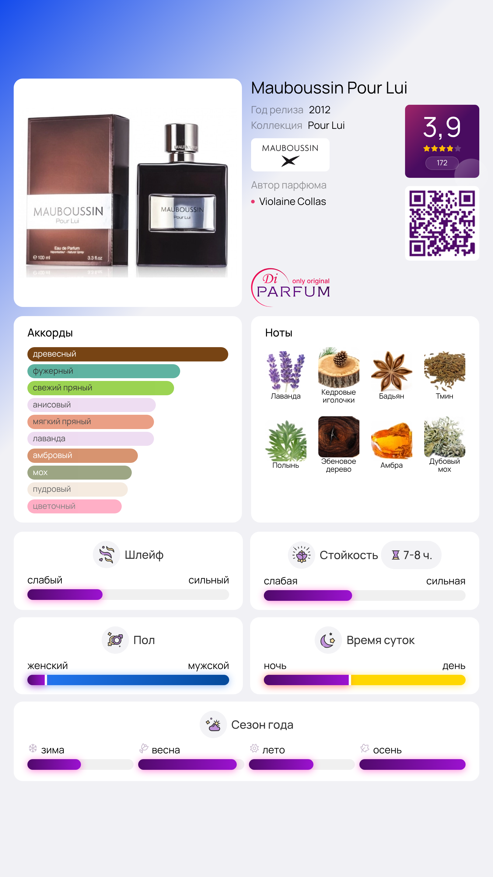 Mauboussin Pour Lui от Mauboussin — это древесно-ароматический аромат для мужчин, который был запущен в 2012 году. Создатель этого парфюма — парфюмер Виолайн Коллас. В верхних нотах ощущается освежающая лаванда и иглы кедра, в сердце гармонично переплетаются тмин, звездчатый анис и абсент, а базу составляют элегантные нотки амбры, эбенового дерева и дубового мха.