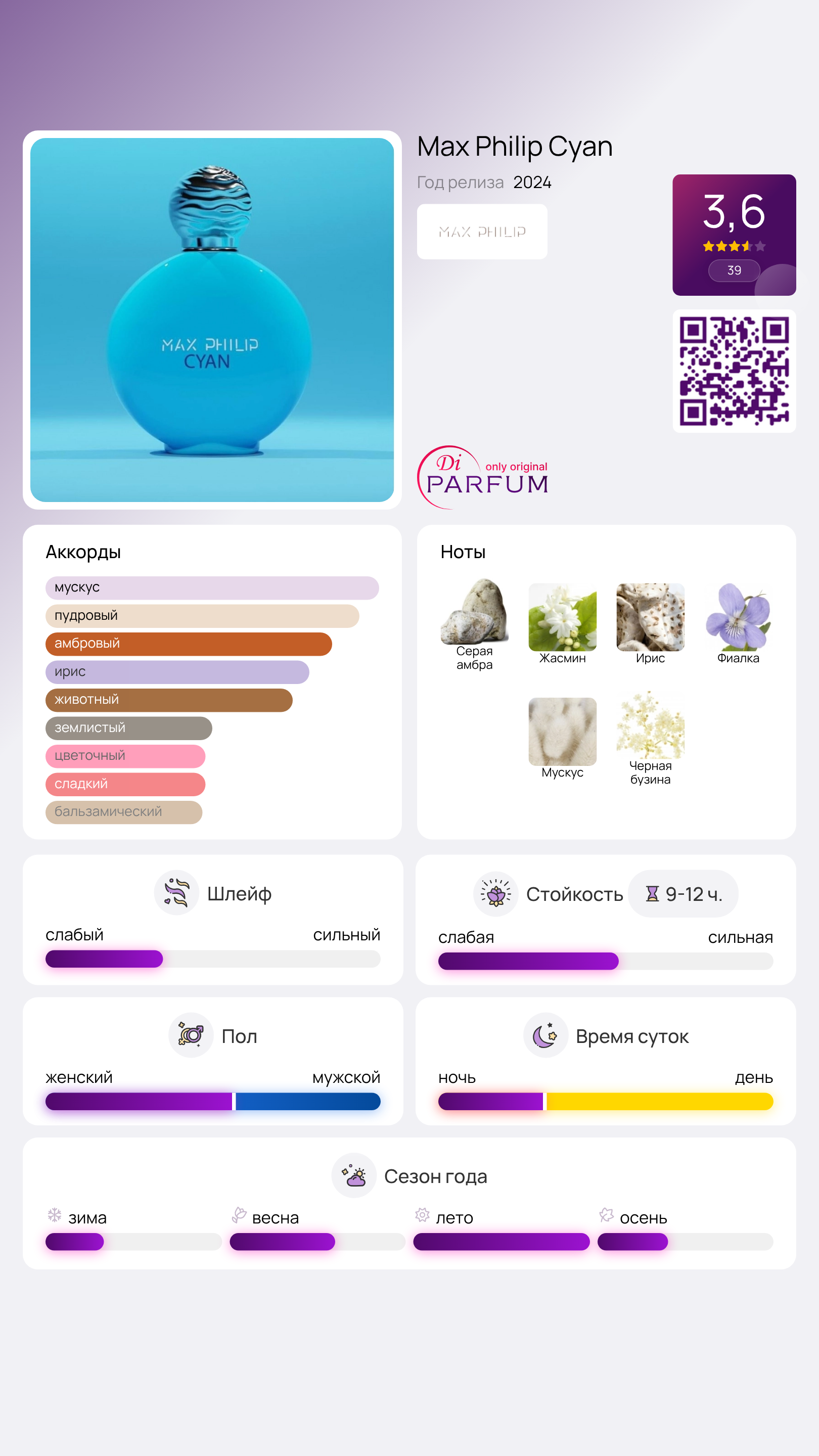 Креация Cyan от Max Philip была представлена в 2024 году знаменитым брендом, известным своим подходом к «бюджетной нише». Этот эликсир станет безусловным фаворитом как мужчин, так и женщин, которые ищут стойкую, качественную и хорошо распределяющуюся парфюмерию. Элегантный флакон с блестящей поверхностью и игривым голубым цветом, его волнистые линии напоминают о текучести природы, а круглая форма символизирует единство и цикличность жизни.
