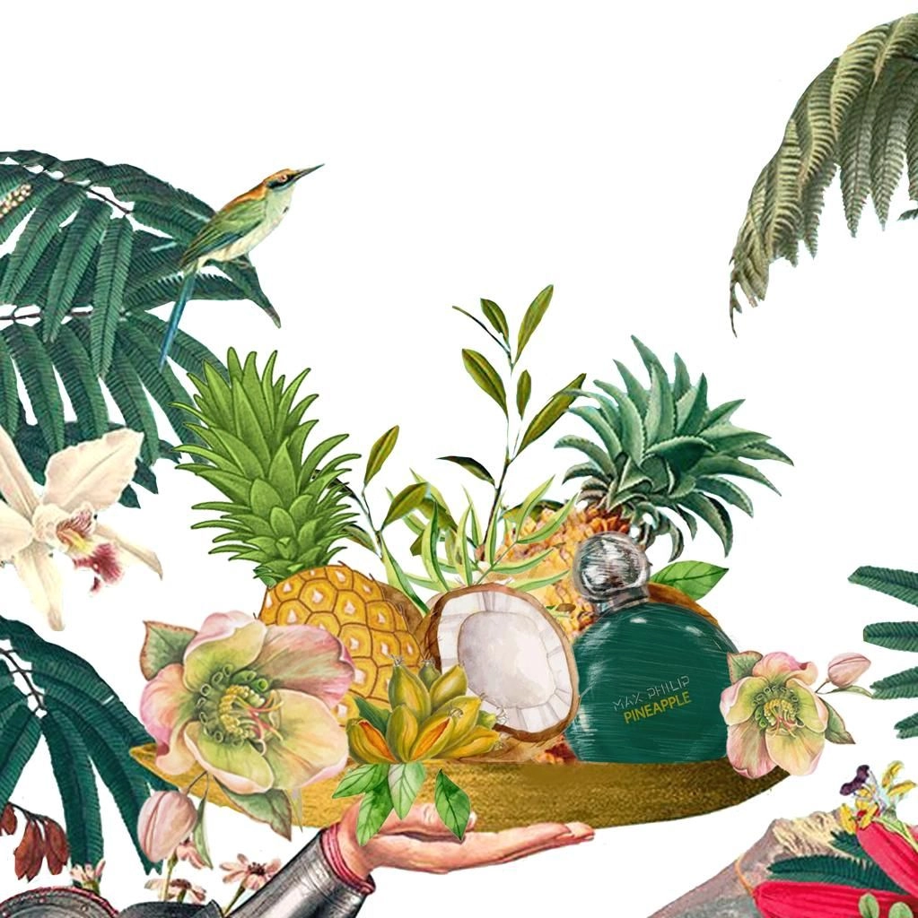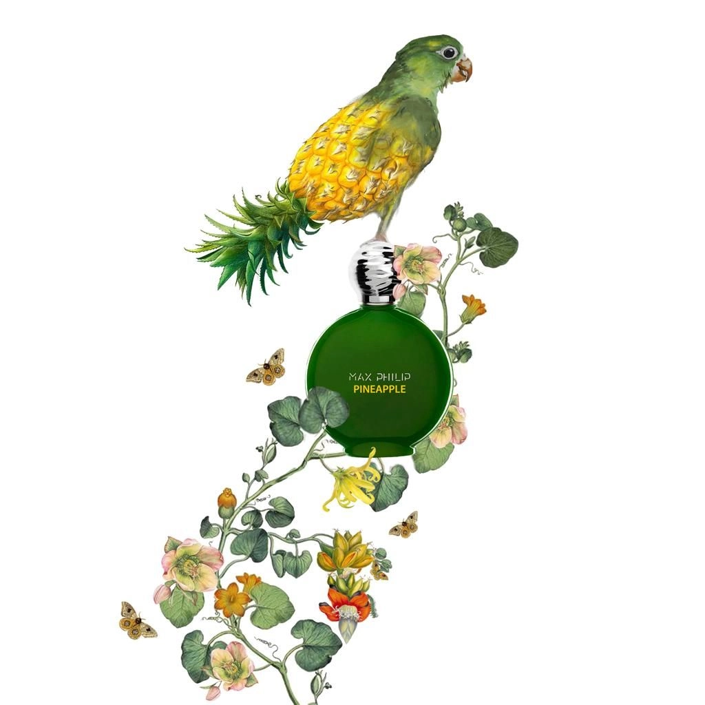 Ободряющий аромат Pineapple от Max Philip выделяется среди других благодаря своей насыщенной концентрации и переливам, которые меняются по мере раскрытия. Данная парфюмерная вода была представлена французским брендом в 2022 году. Ее флакон выполнен в виде сферической формы с темно-зеленым глянцем, что вызывает ассоциации с ананасом, увенчанным серебристым хвостиком. Надпись на упаковке также окрашена в цвет спелого плода, а вместо традиционной коробки используется шкатулка с черным бархатом внутри.
