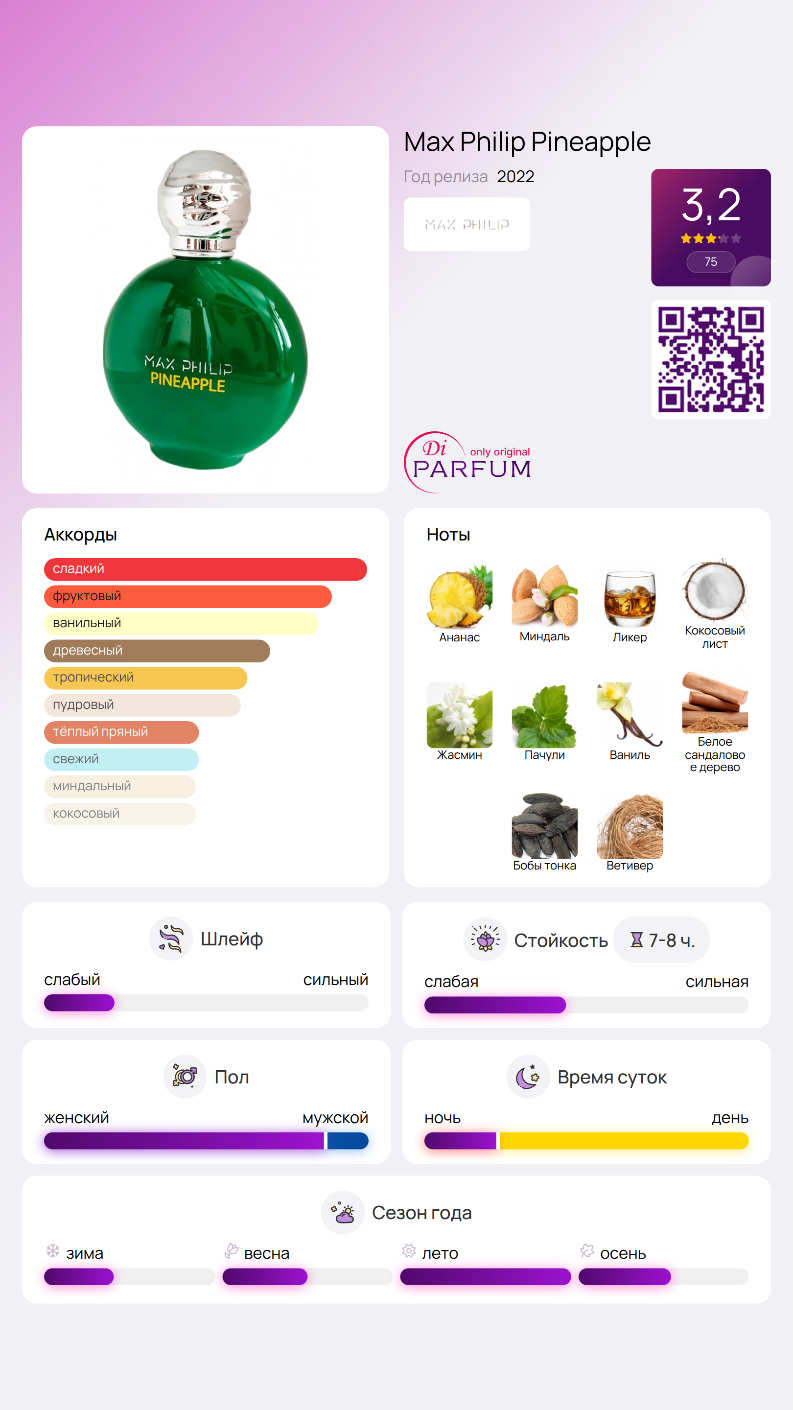 Ободряющий аромат Pineapple от Max Philip выделяется среди других благодаря своей насыщенной концентрации и переливам, которые меняются по мере раскрытия. Данная парфюмерная вода была представлена французским брендом в 2022 году. Ее флакон выполнен в виде сферической формы с темно-зеленым глянцем, что вызывает ассоциации с ананасом, увенчанным серебристым хвостиком. Надпись на упаковке также окрашена в цвет спелого плода, а вместо традиционной коробки используется шкатулка с черным бархатом внутри.