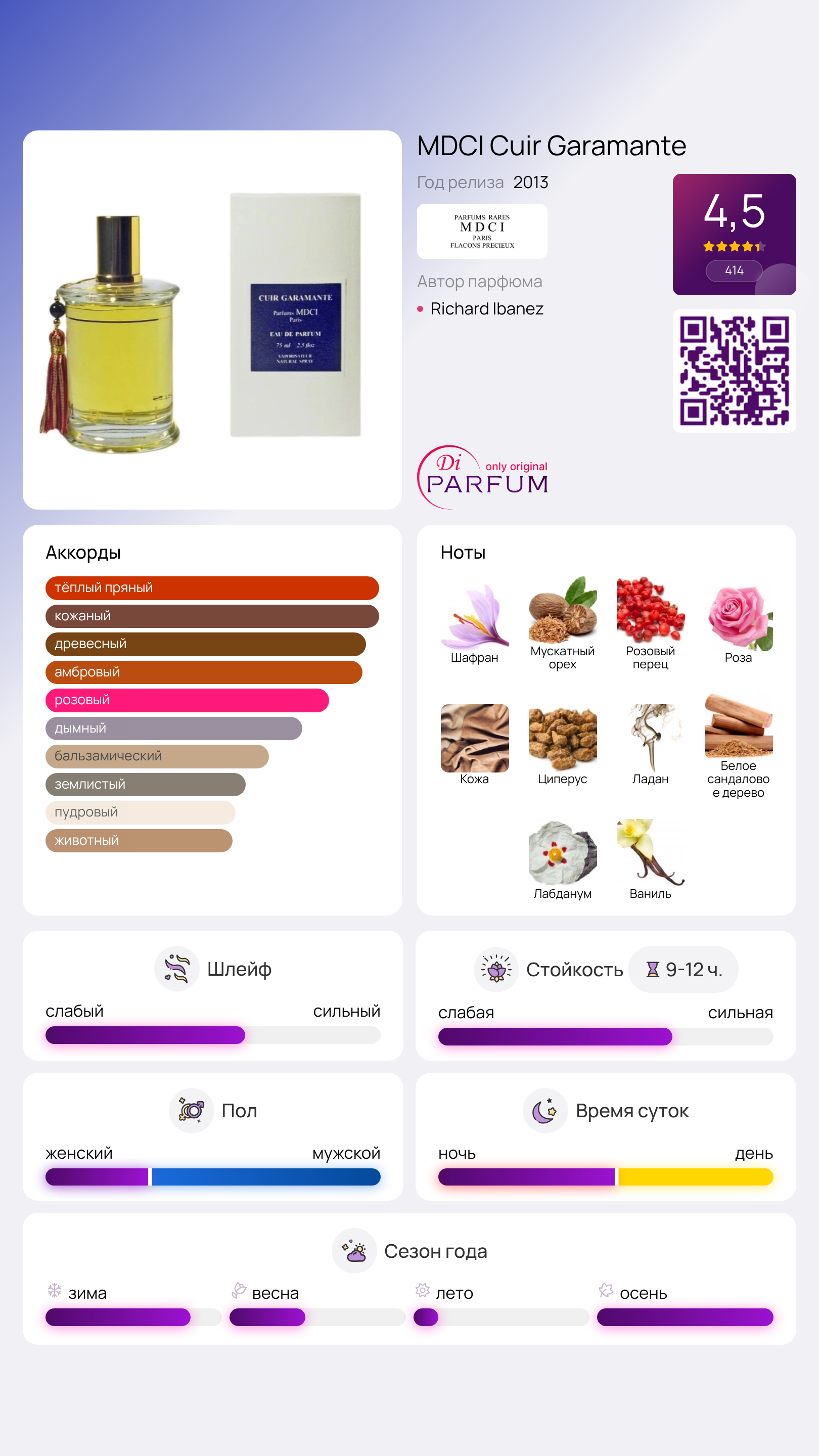 Композиция начинается с кожи, сопровождаемой нотами шафрана, розового перца и мускатного ореха. Постепенно на первый план выходит кожа, ей вторят роза и циперус. Завершает ароматная палитра ваниль, ладан, лабданум и сандал. Важно отметить, что производитель может предлагать данный аромат без статуэток на крышке.