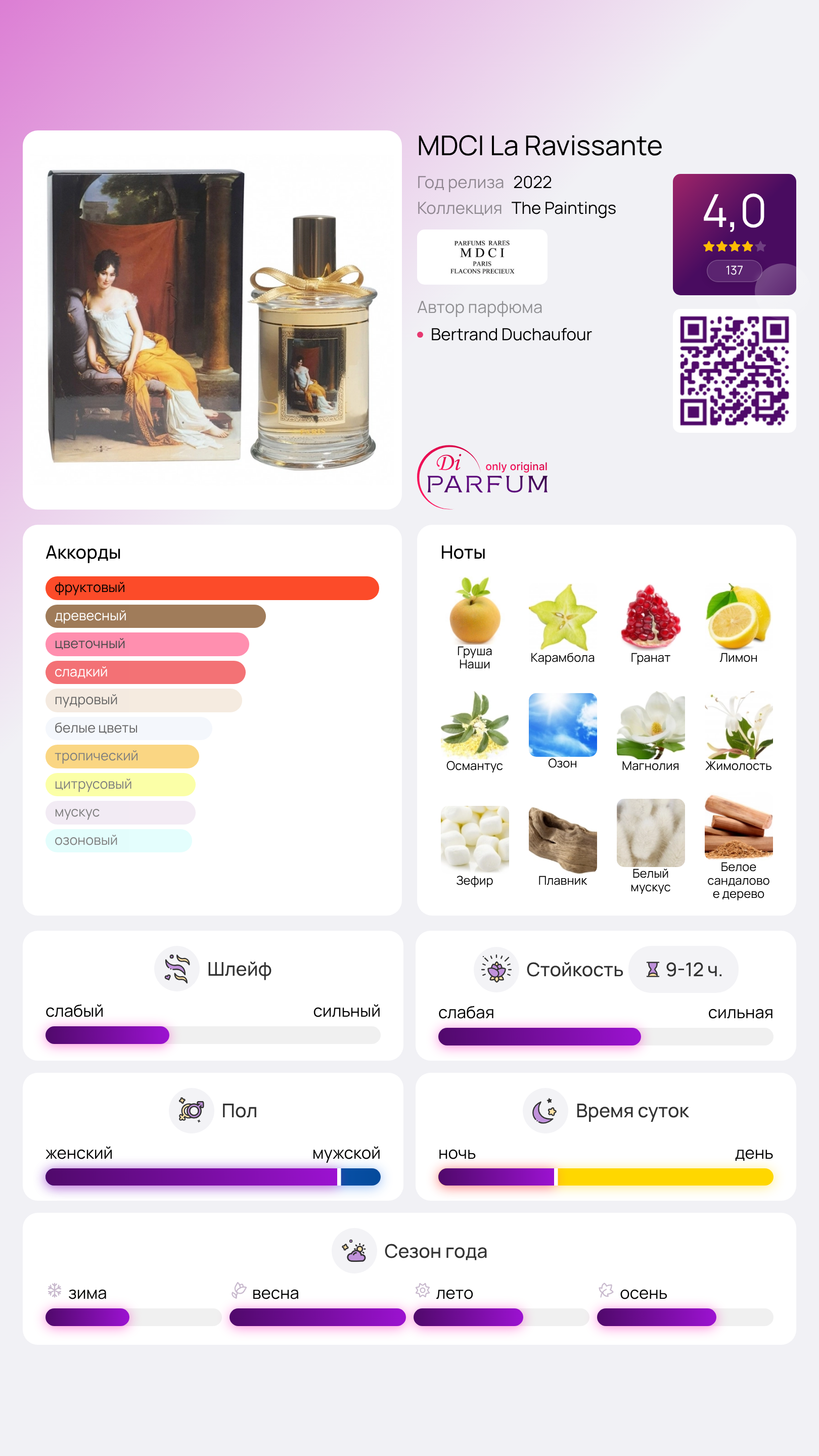 Аромат MDCI La Ravissante представляет собой гармоничное сочетание цветочных и фруктовых нот, рассказывая о женственности, доверии и верности. Этот парфюм черпает вдохновение из портрета мадам Рекамье, изображенной художником Франсуа Жераром, который стал музой для многих поэтов. Сегодня эта картина хранится в Музее Carnavalet в Париже.