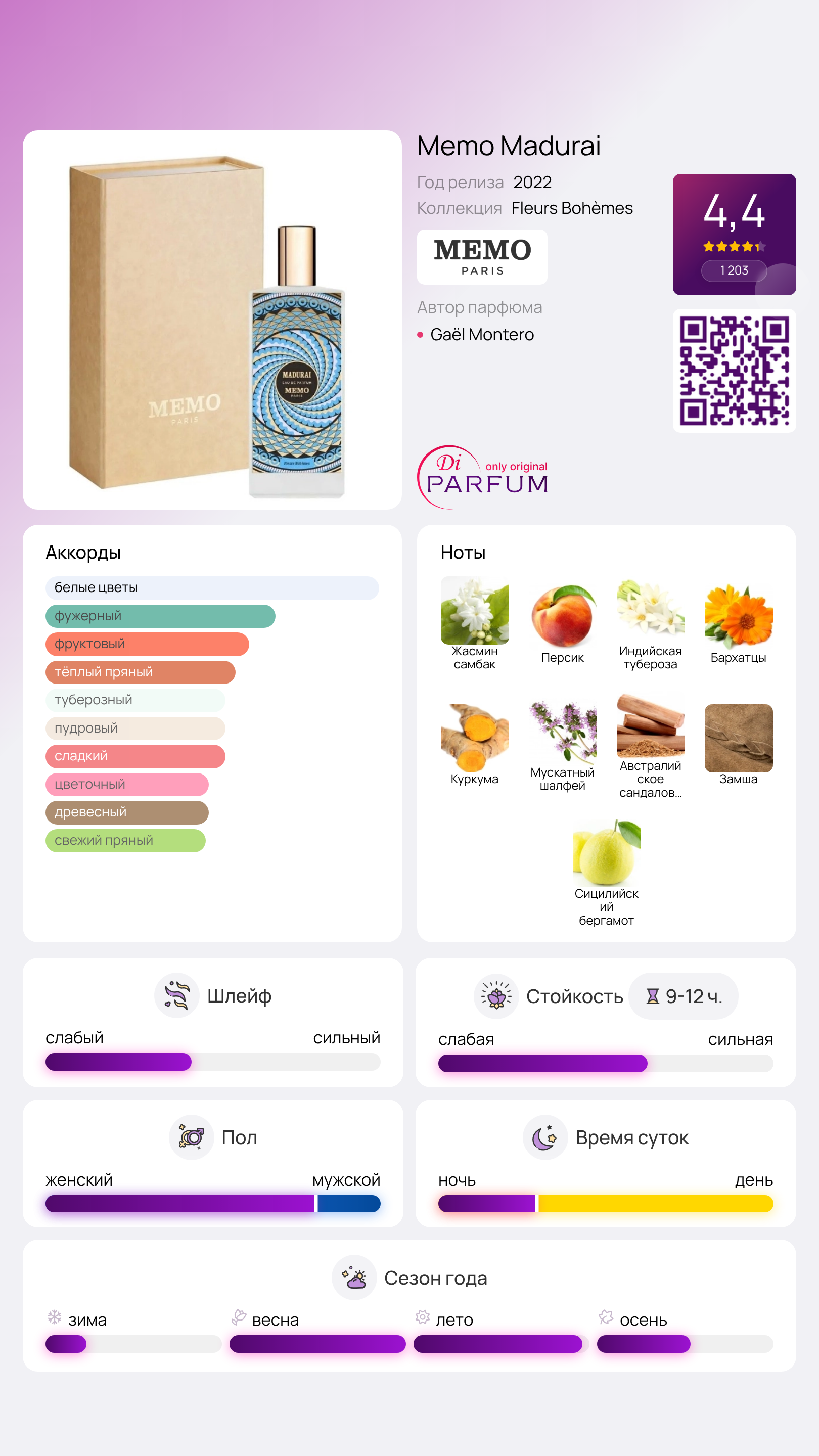 Эти цветочные ноты объединяются с древесной куркумой, создавая запах, который заполняет храм Минакши. Внутри храма благоухает мир цветов и сандала, оживляя статуи и унося их в танец под еле слышимые звуки ветра. Эфирное масло острых и травянистых бархатцев, которое путешествовало через Индийский океан, придаёт аромату яблочные ноты.