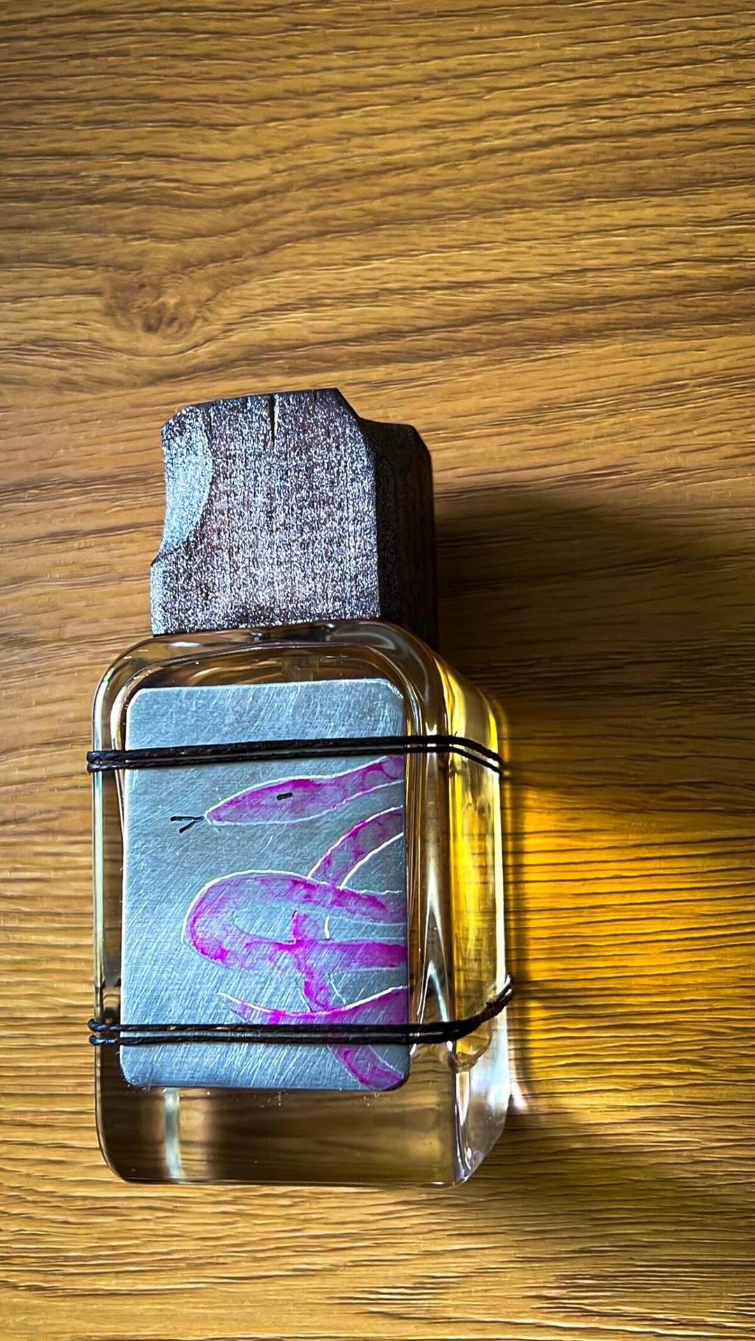 Пламя поднимается вверх, смешиваясь с роскошными нотами шафрана и бальзамическими аккордами уда, а также с анималистическими флюидами мускуса, ноту горечи добавляет папирус, пропитанный землею. Завершает эту композицию запашная кожа, овеянная дымом, словно она впитала в себя дух коллекционного рома.