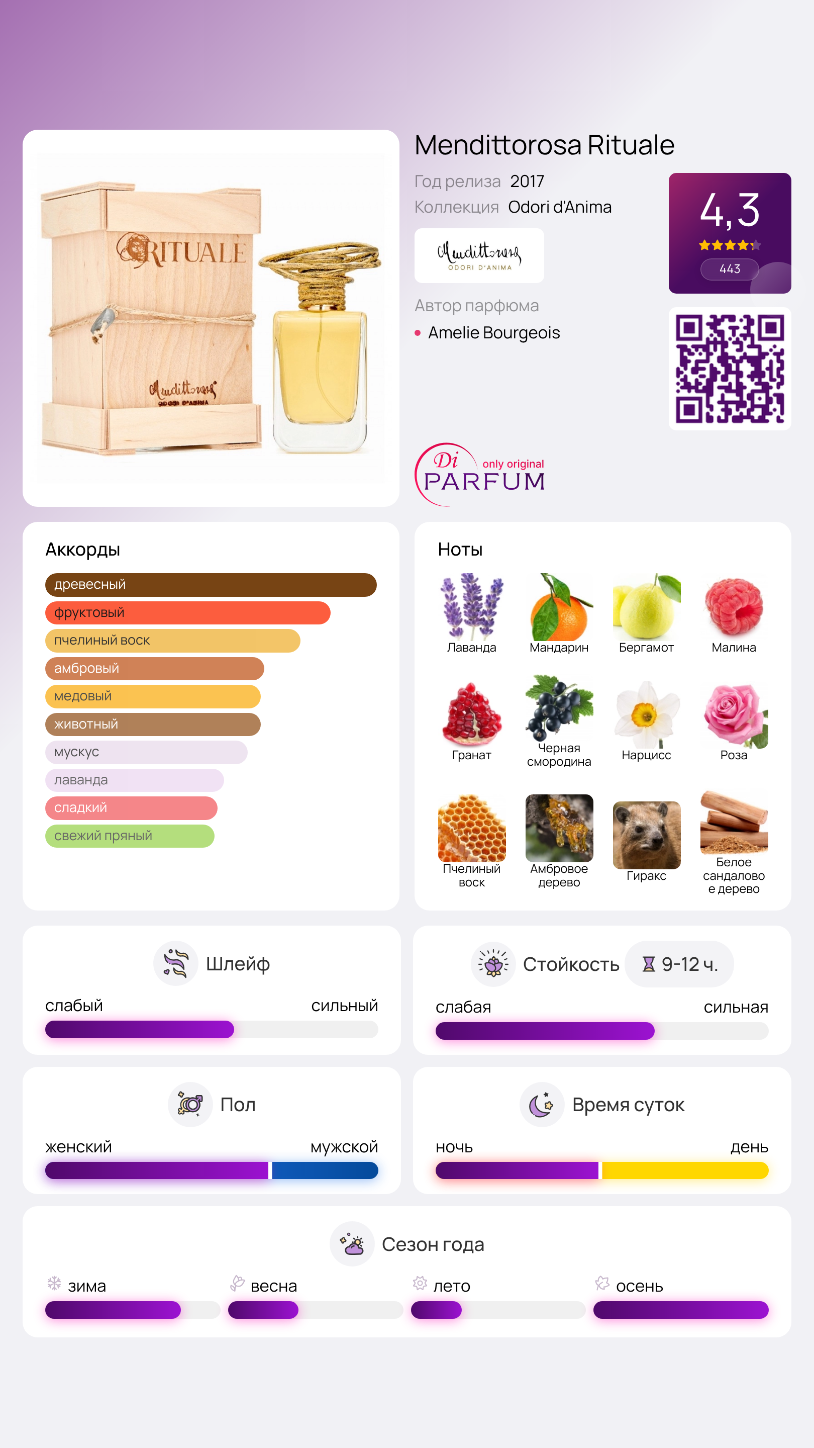 Rituale от Mendittorosa — это цветочно-древесно-мускусный аромат, который подходит как женщинам, так и мужчинам. Запуск аромата состоялся в 2017 году, а его создателем является талантливый парфюмер Amelie Bourgeois. В верхних нотах раскрываются свежие аккорды лаванды, мандарина и бергамота, создавая легкое и бодрящее начало. Сердце композиции наполнено сочными гранатом, черной смородиной, малиной, а также изысканными цветами нарцисса, розы и жасмина. Завершающие ноты становятся более глубокими и загадочными — благодаря пачули, сандалу, пчелиному воску, древесному янтарю, белому мускусу и даману.